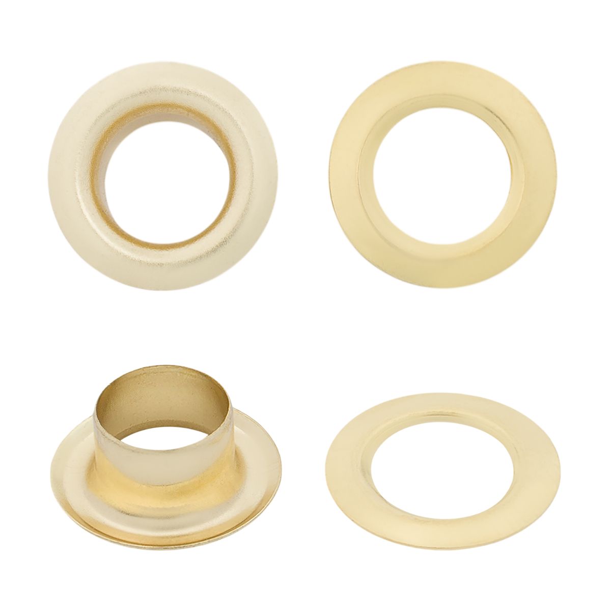 Люверсы позволяют аккуратно оформить шнуровку и укрепить края отверстий для шнуровки, защитить их от трения. Подходят для поясов, а также создания шнуровки на обуви, верхней одежде, корсетах, чехлах, тентах и других изделиях из плотных материалов. Инструмент для установки приобретается отдельно. Люверсы изготовлены из металла, выдерживают стандартные нагрузки, сохраняют цвет. Как установить: люверс состоит из шайбы и втулки со шляпкой. Наденьте втулку со шляпкой на лицевую часть изделия, а на изнаночную – кольцо. Затем закрепите люверсы с помощью инструмента для установки. Цвет: золото.