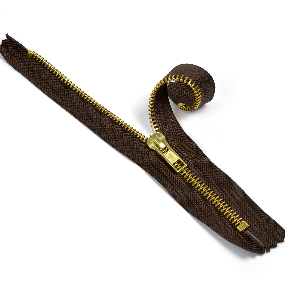Молния металл джинсовая Т5 (5 мм) 1 зам., н/раз., золото, 18 см, цв.F304 т.коричневый уп.10 шт