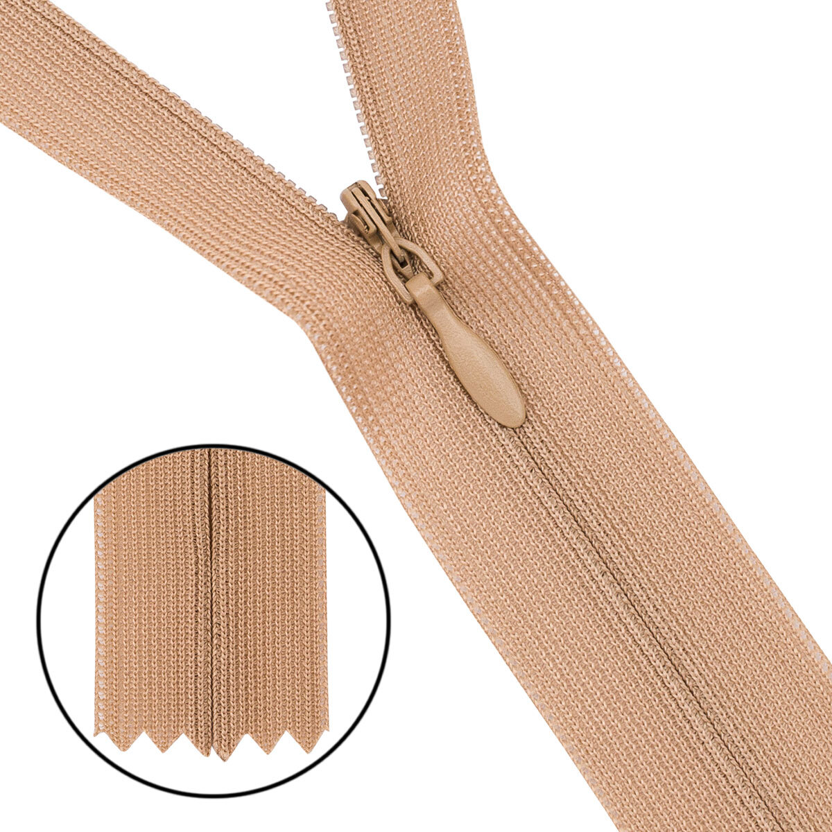 Молния витая потайная имеет особое строение. Её звенья расположены на изнаночной стороне застежки и прикрыты текстильной лентой. С лицевой стороны находится только бегунок, поэтому такая молния на готовом изделии почти незаметна. Потайные молнии используют при изготовлении одежды для взрослых и детей: юбок, блузок, платьев, трикотажных изделий, а также постельного белья, предметов домашнего обихода, разнообразных аксессуаров. Молния выполнена из материалов высокого качества. Текстильная лента из полиэстера не линяет при стирке и химической чистке. Звенья изготовлены нейлона, размер 3 мм, молния плотно смыкается, имеет небольшой вес, подходит для легких тканей. Изящный металлический слайдер свободно скользит по тесьме.