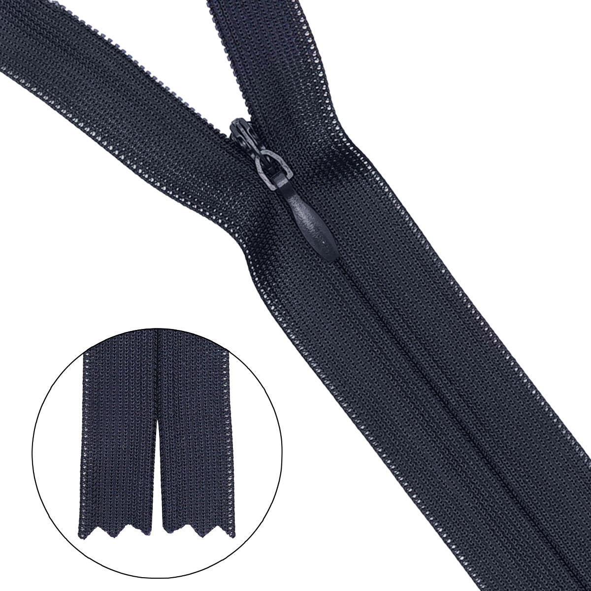 Молния витая потайная имеет особое строение. Её звенья расположены на изнаночной стороне застежки и прикрыты текстильной лентой. С лицевой стороны находится только бегунок, поэтому такая молния на готовом изделии почти незаметна. Потайные молнии используют при изготовлении одежды для взрослых и детей: юбок, блузок, платьев, трикотажных изделий, а также постельного белья, предметов домашнего обихода, разнообразных аксессуаров. Молния выполнена из материалов высокого качества. Текстильная лента из полиэстера не линяет при стирке и химической чистке. Звенья изготовлены нейлона, размер 3 мм, молния плотно смыкается, имеет небольшой вес, подходит для легких тканей. Изящный металлический слайдер свободно скользит по тесьме.