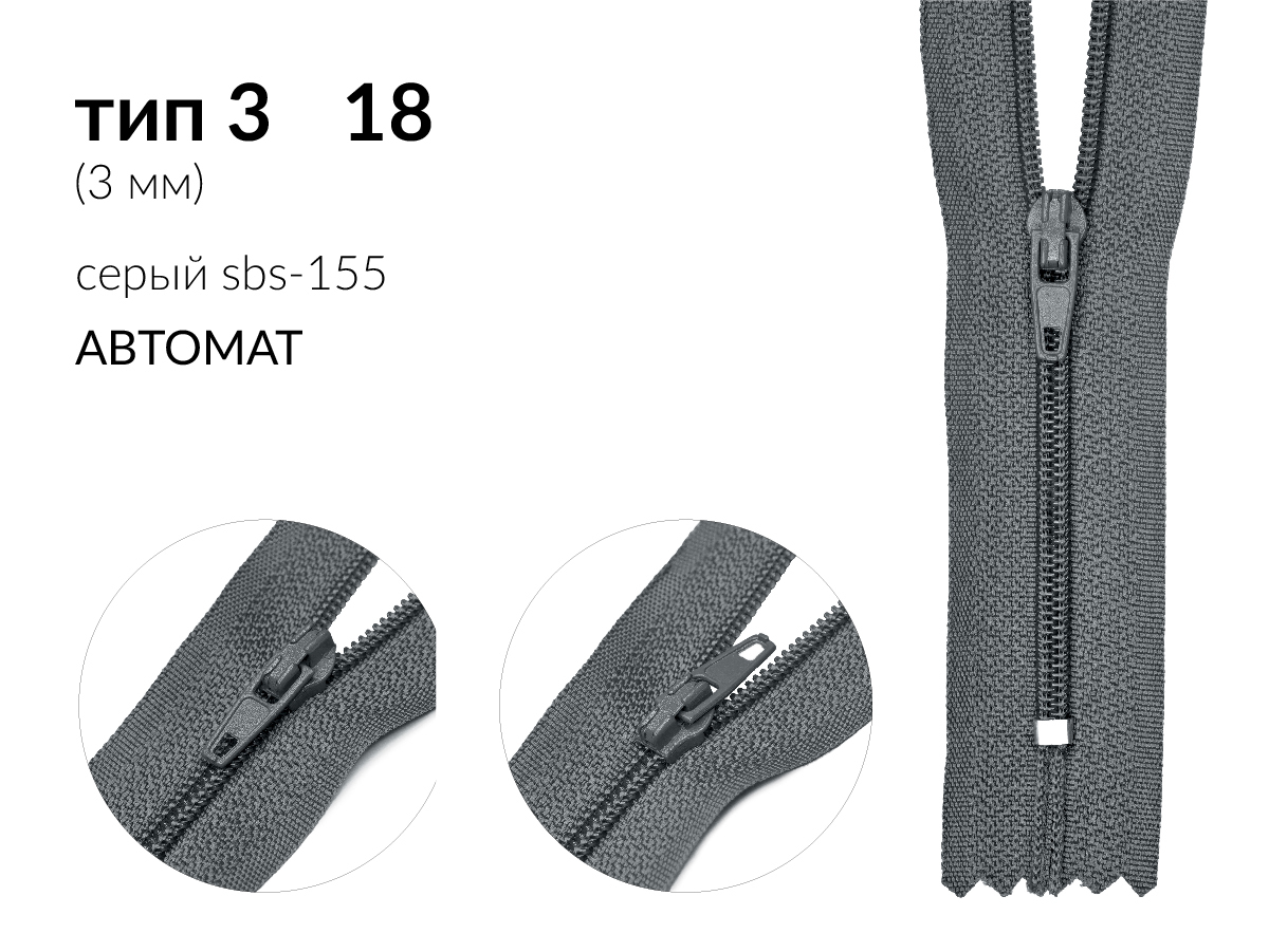Молния спираль (витая) (цв.SBS) брючная Т3 (3 мм) 1 зам., н/раз., 18 см, автомат, S-155 серый, уп.5000 шт