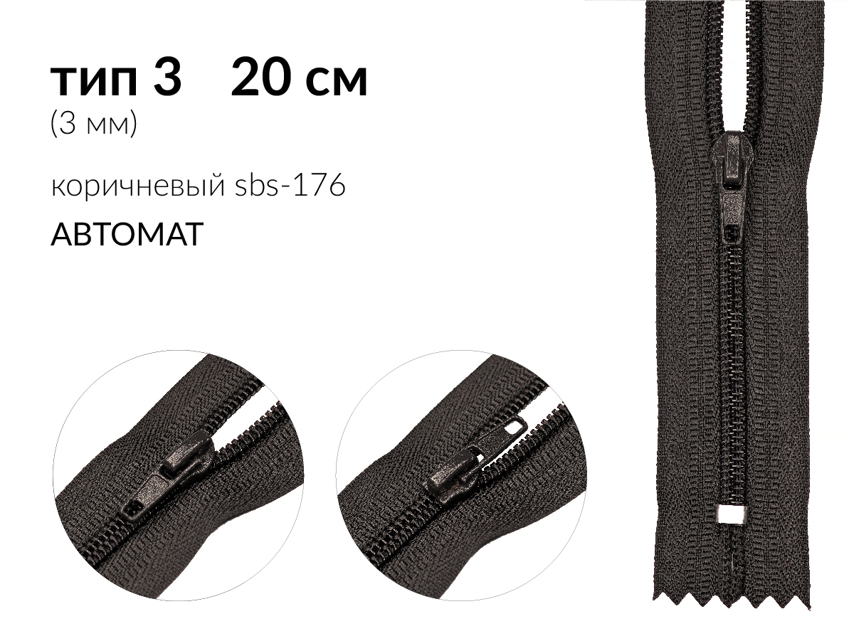 Молния спираль (витая) (цв.SBS) брючная Т3 (3 мм) 1 зам., н/раз., 20 см, автомат, S-176 коричневый, уп.100 шт