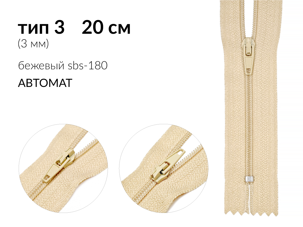 Молния спираль (витая) (цв.SBS) брючная Т3 (3 мм) 1 зам., н/раз., 20 см, автомат, S-180 бежевый, уп.5000 шт
