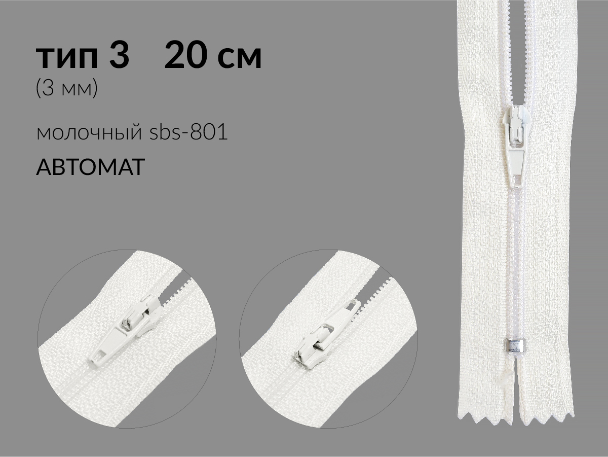 Молния спираль (витая) (цв.SBS) брючная Т3 (3 мм) 1 зам., н/раз., 20 см, автомат, S-801 молочная, уп.5000 шт