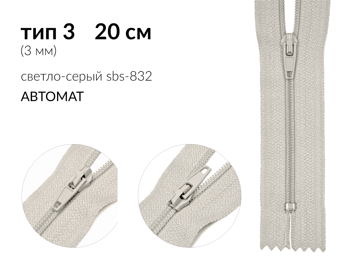 Молния спираль (витая) (цв.SBS) брючная Т3 (3 мм) 1 зам., н/раз., 20 см, автомат, S-832 светло-серый, уп.5000 шт