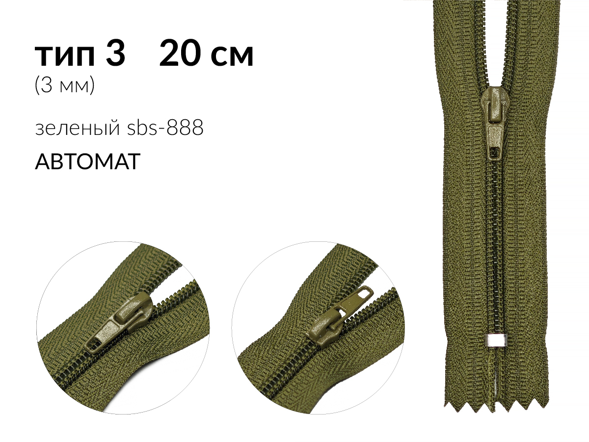 Молния спираль (витая) (цв.SBS) брючная Т3 (3 мм) 1 зам., н/раз., 20 см, автомат, S-888 зеленый, уп.5000 шт