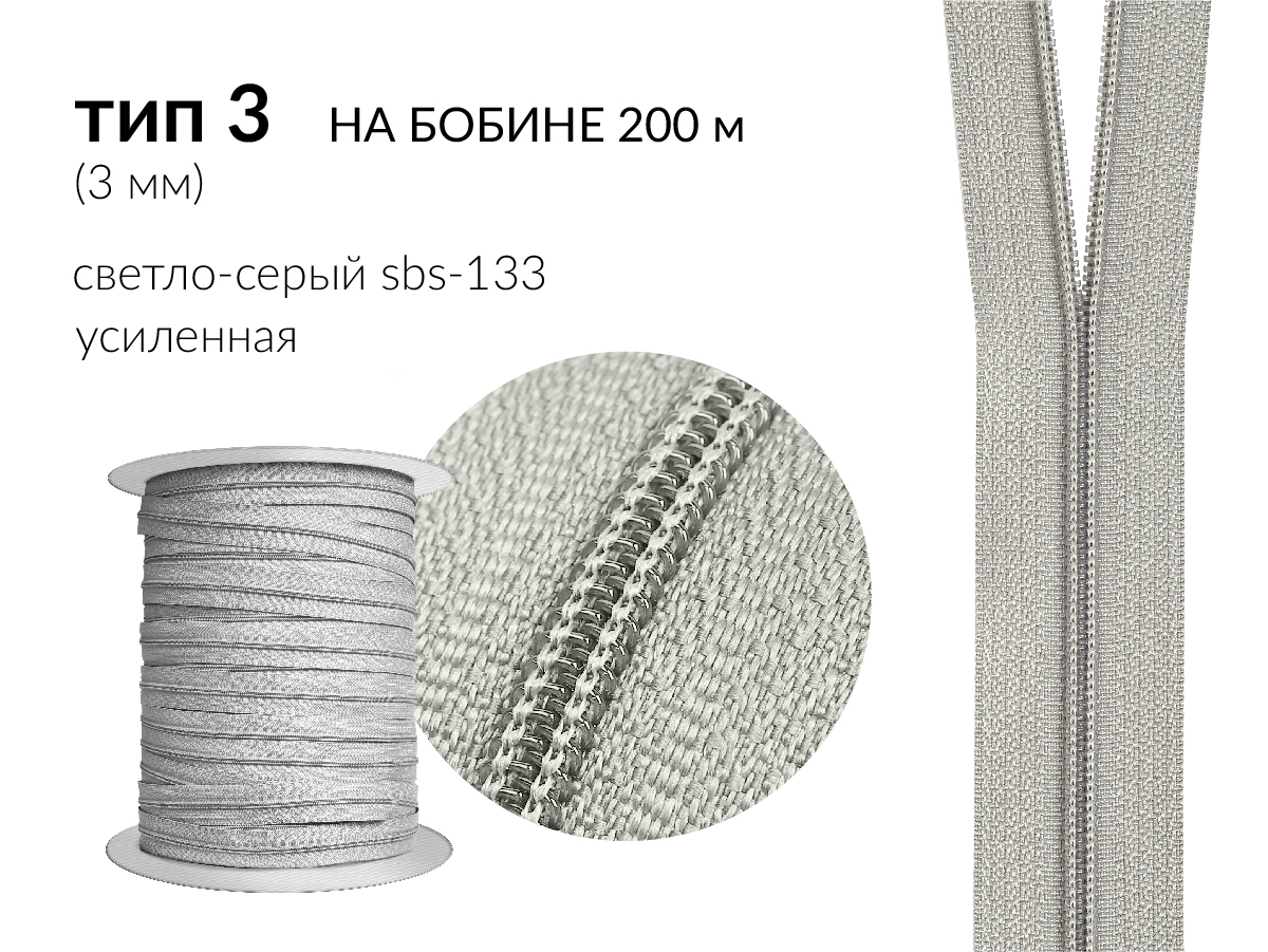 Молния рулонная витая (спираль) Т3 (3 мм) УСИЛЕННАЯ, НА БОБИНЕ, S-133 св.серый (цв.SBS) / кор. 1200 метров