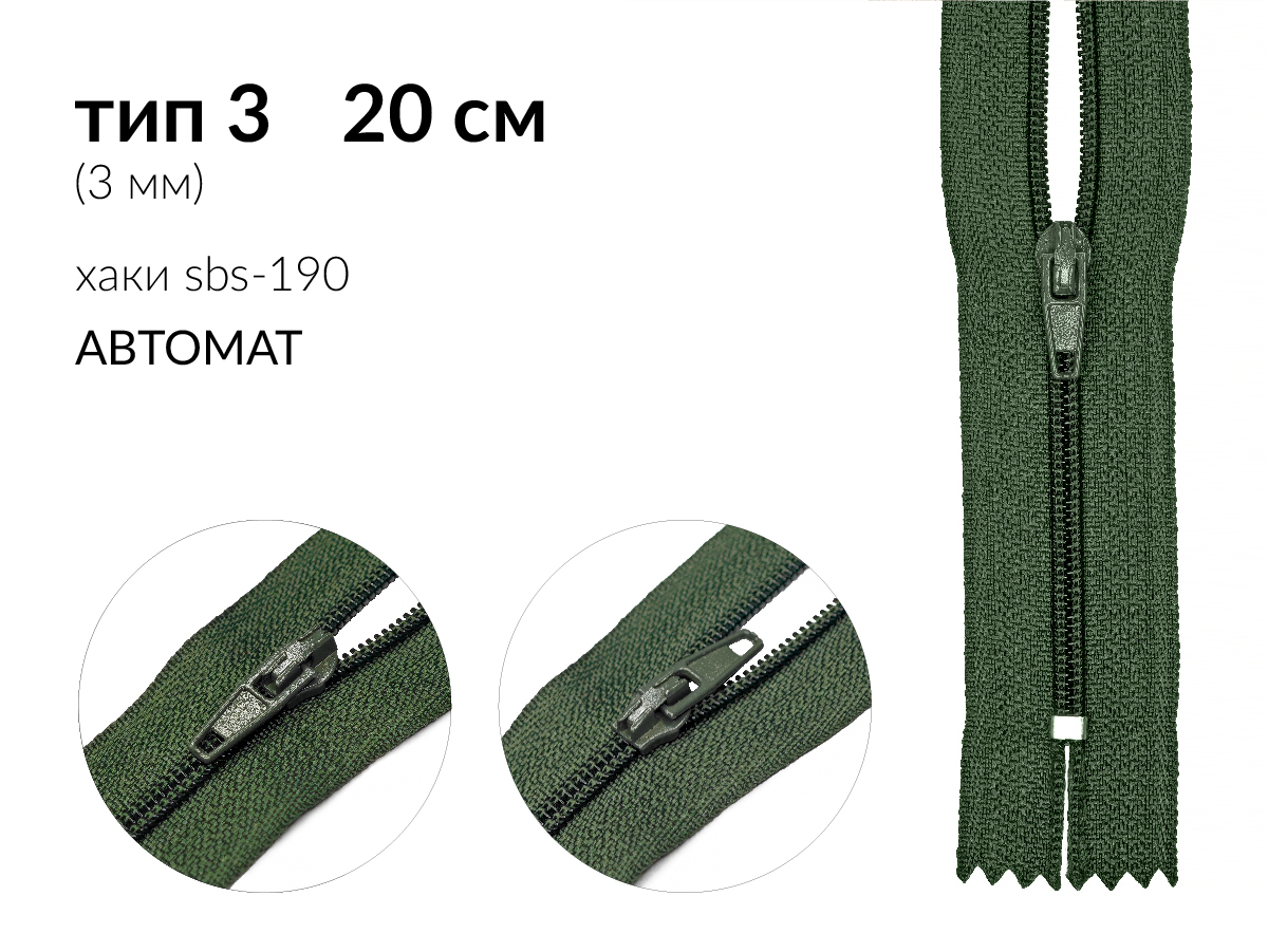 Молния спираль (витая) (цв.SBS) брючная Т3 (3 мм) 1 зам., н/раз., 20 см, автомат, S-190 хаки, 5000 шт