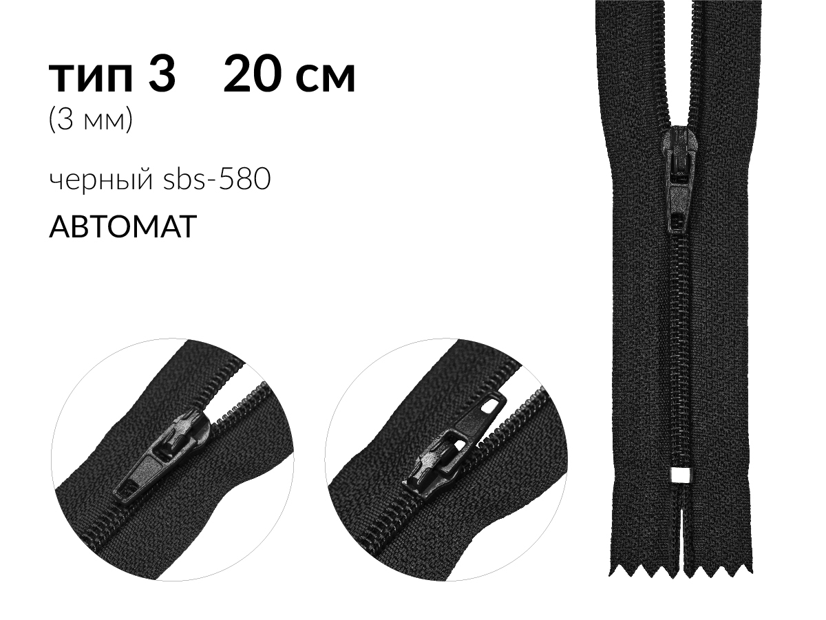 Молния спираль (витая) (цв.SBS) брючная Т3 (3 мм) 1 зам., н/раз., 20 см, автомат, S-580 черный, 5000 шт
