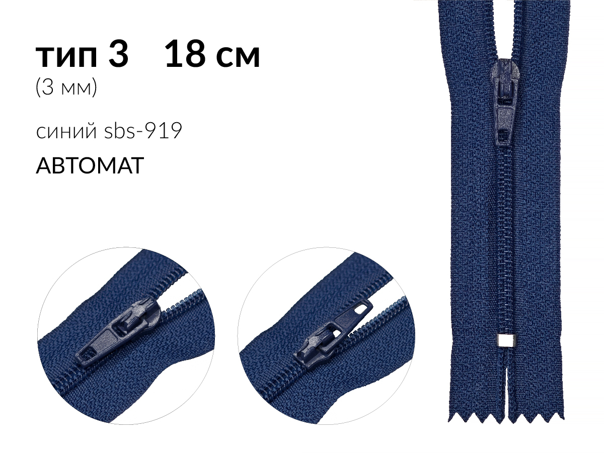 Молния спираль (витая) (цв.SBS) брючная Т3 (3 мм) 1 зам., н/раз., 18 см, автомат, S-919 синий, 5000 шт