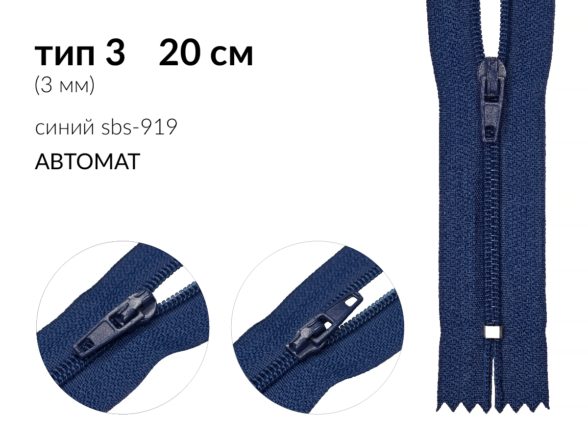 Молния спираль (витая) (цв.SBS) брючная Т3 (3 мм) 1 зам., н/раз., 20 см, автомат, S-919 синий, 5000 шт