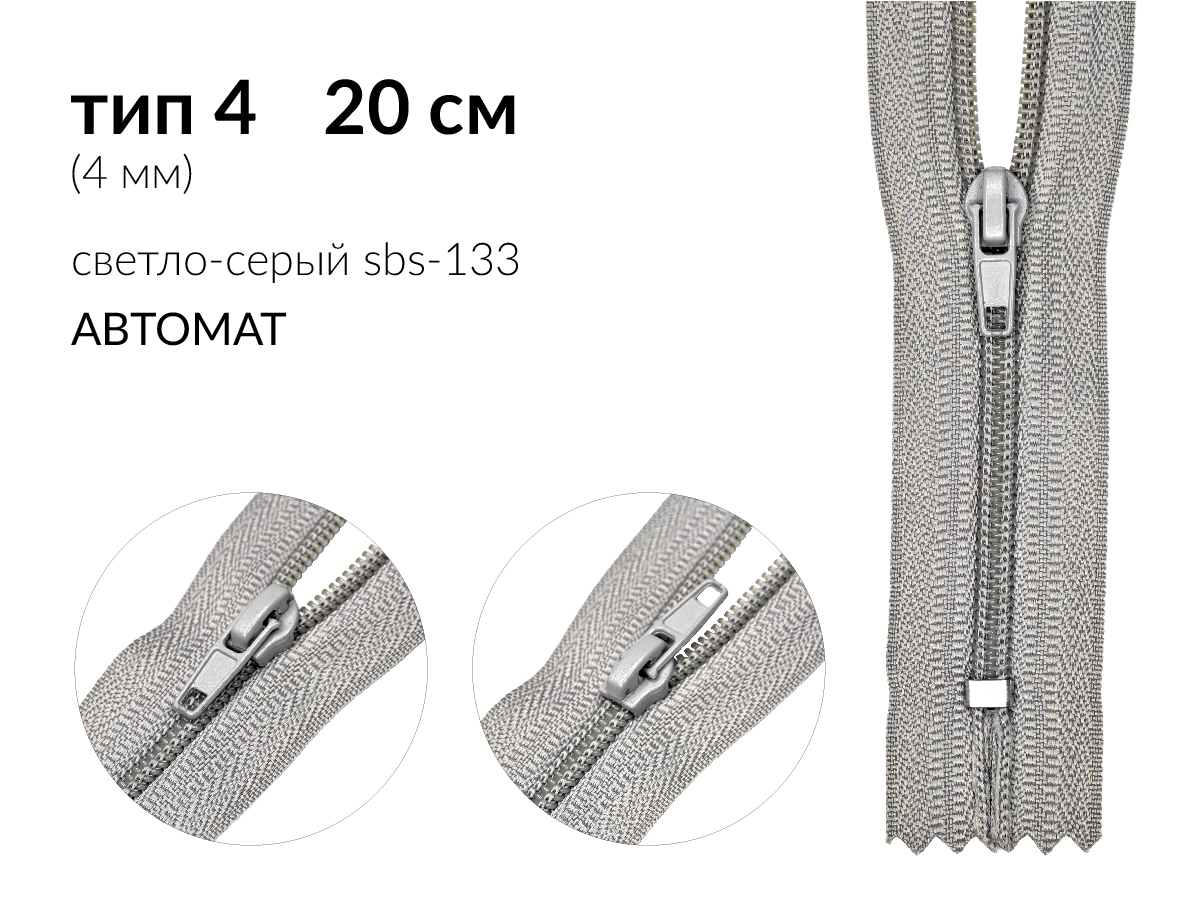 Молния спираль (витая) (цв.SBS) брючная Т4 (4 мм) 1 зам., н/раз., 20 см, автомат, S-133 св.серый, 2500 шт