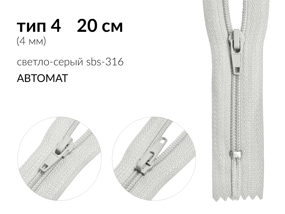 Молния спираль (витая) (цв.SBS) брючная Т4 (4 мм) 1 зам., н/раз., 20 см, автомат, S-316 св.серый, 2500 шт