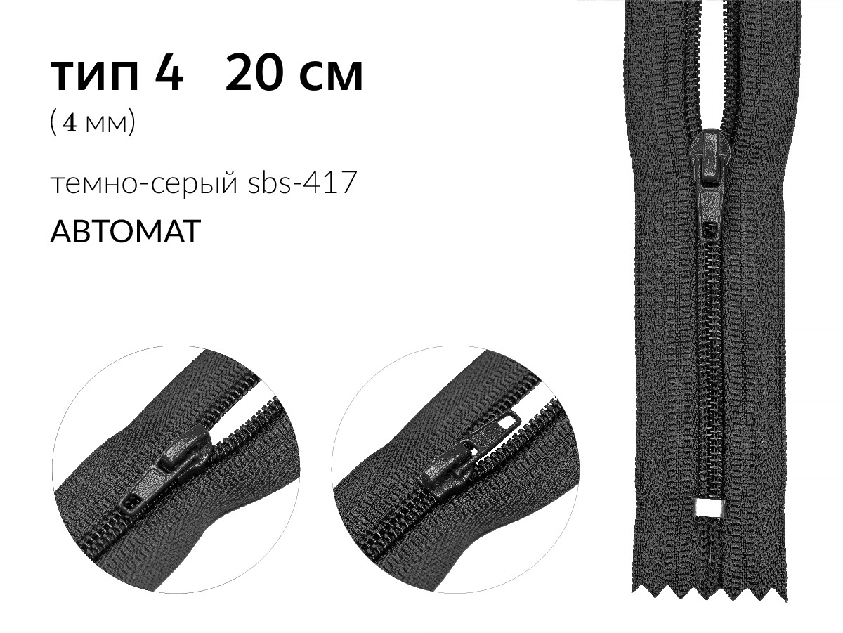 Молния спираль (витая) (цв.SBS) брючная Т4 (4 мм) 1 зам., н/раз., 20 см, автомат, S-417 т.серый, 2500 шт