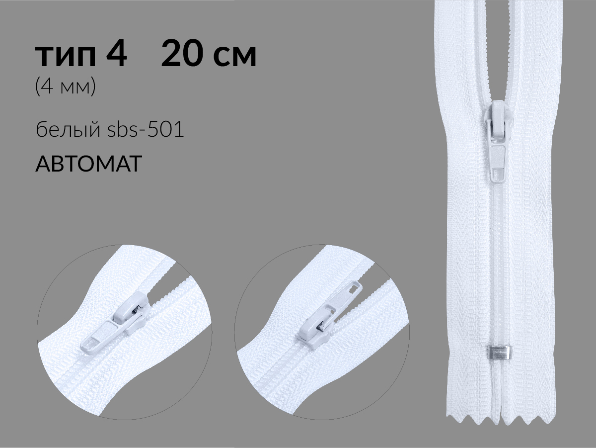 Молния спираль (витая) (цв.SBS) брючная Т4 (4 мм) 1 зам., н/раз., 20 см, автомат, S-501 белая, 2500 шт