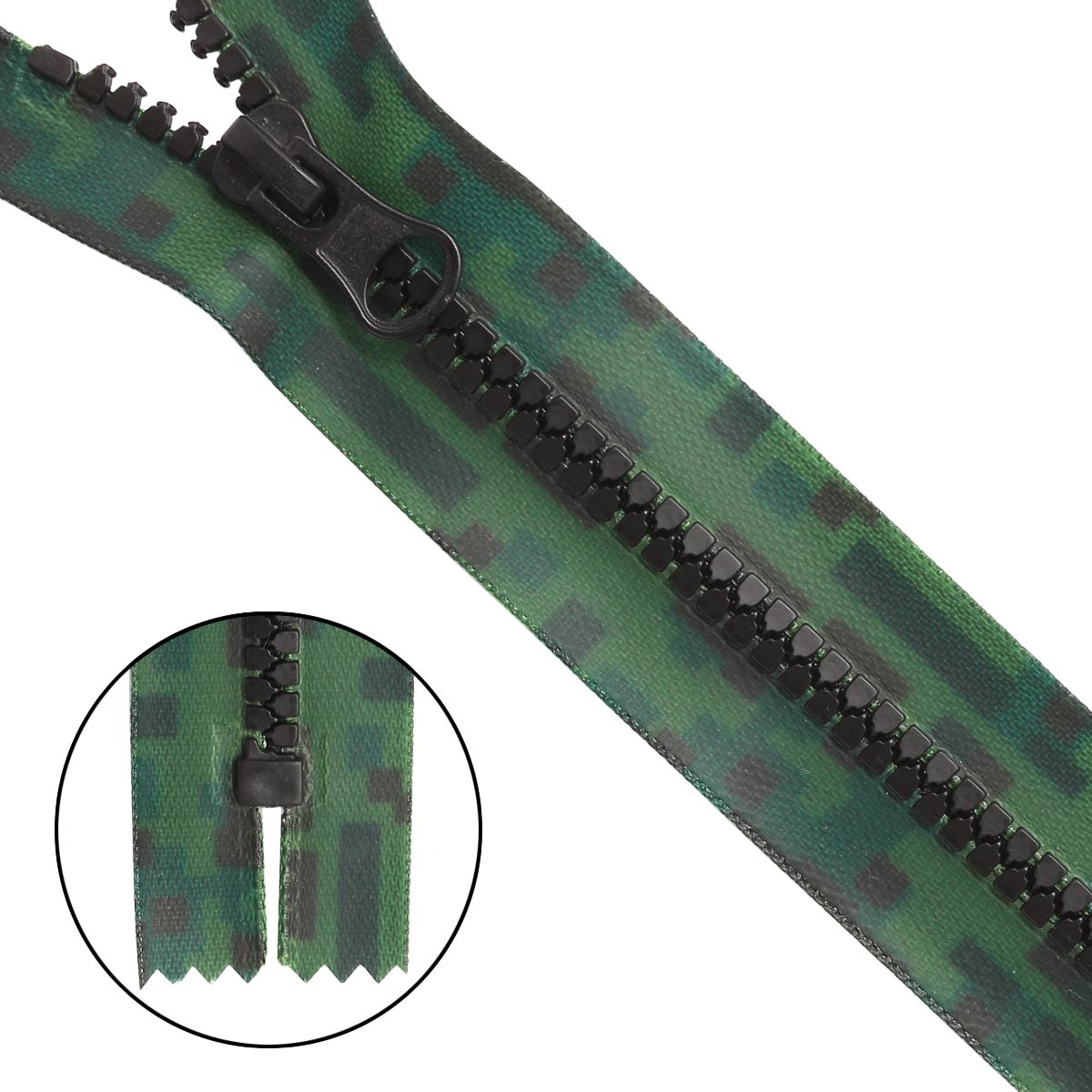 Молния трактор Т5 (5 мм) 1 зам., разъем., 18 см, декор. звено акулий зуб, принт Милитари, н/раз., хаки, 10 шт