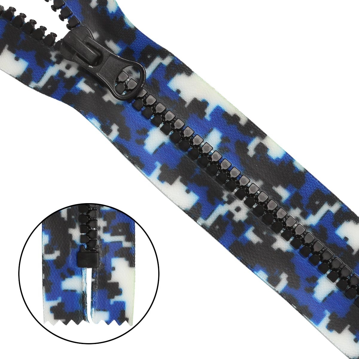 Молния трактор Т5 (5 мм) 1 зам., разъем., 18 см, декор. звено акулий зуб, принт Милитари, н/раз., синий, 10 шт