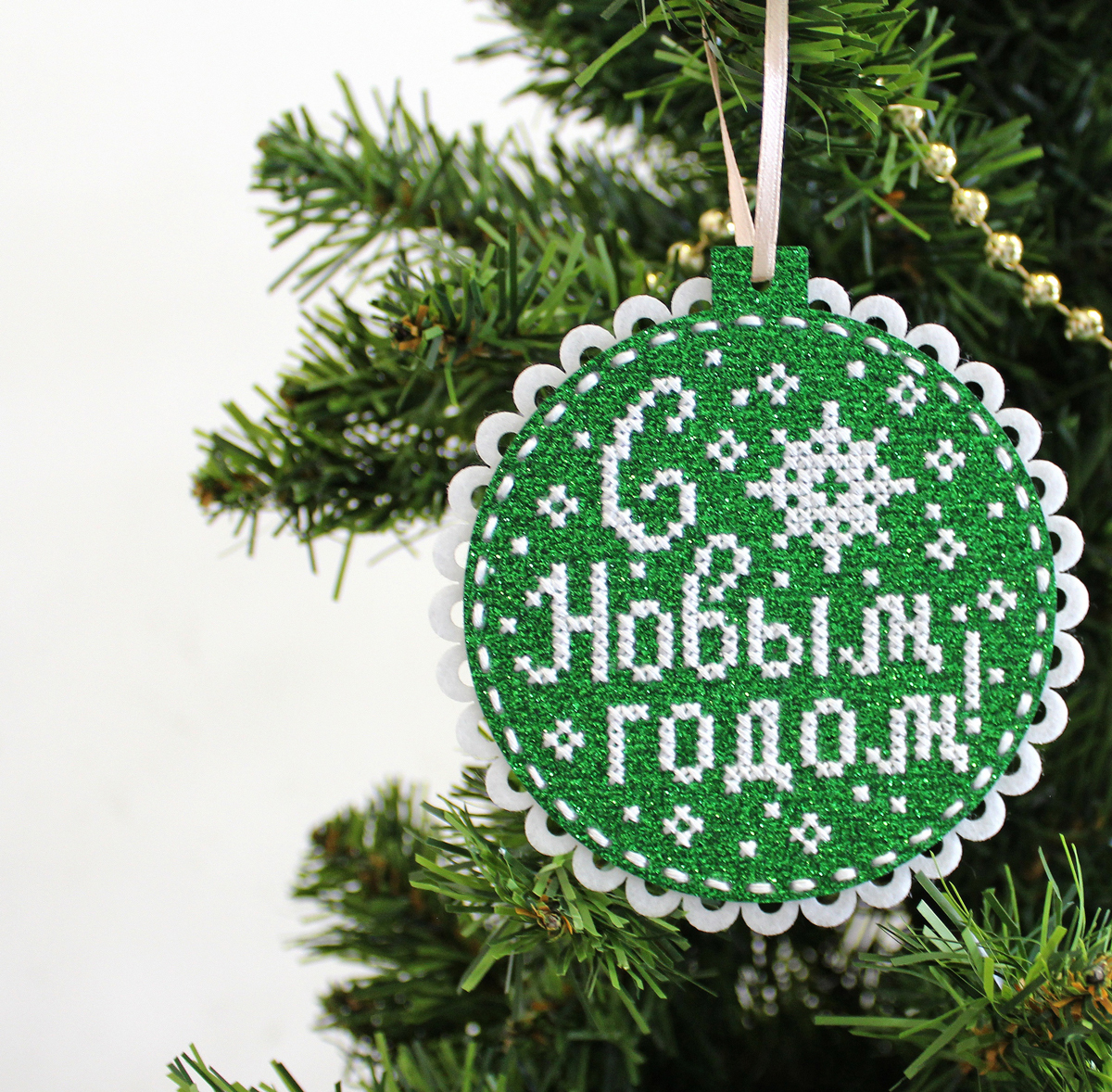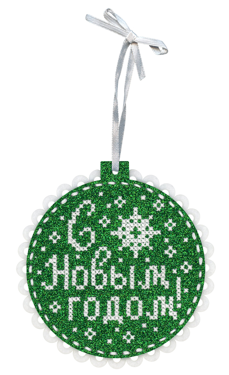 Состав: перфорированная основа из глиттерного фетра, фетр для обработки изнанки, мулине ПНК им.Кирова 1 цвета, игла, атласная лента, двуцветная символьная схема, инструкция.