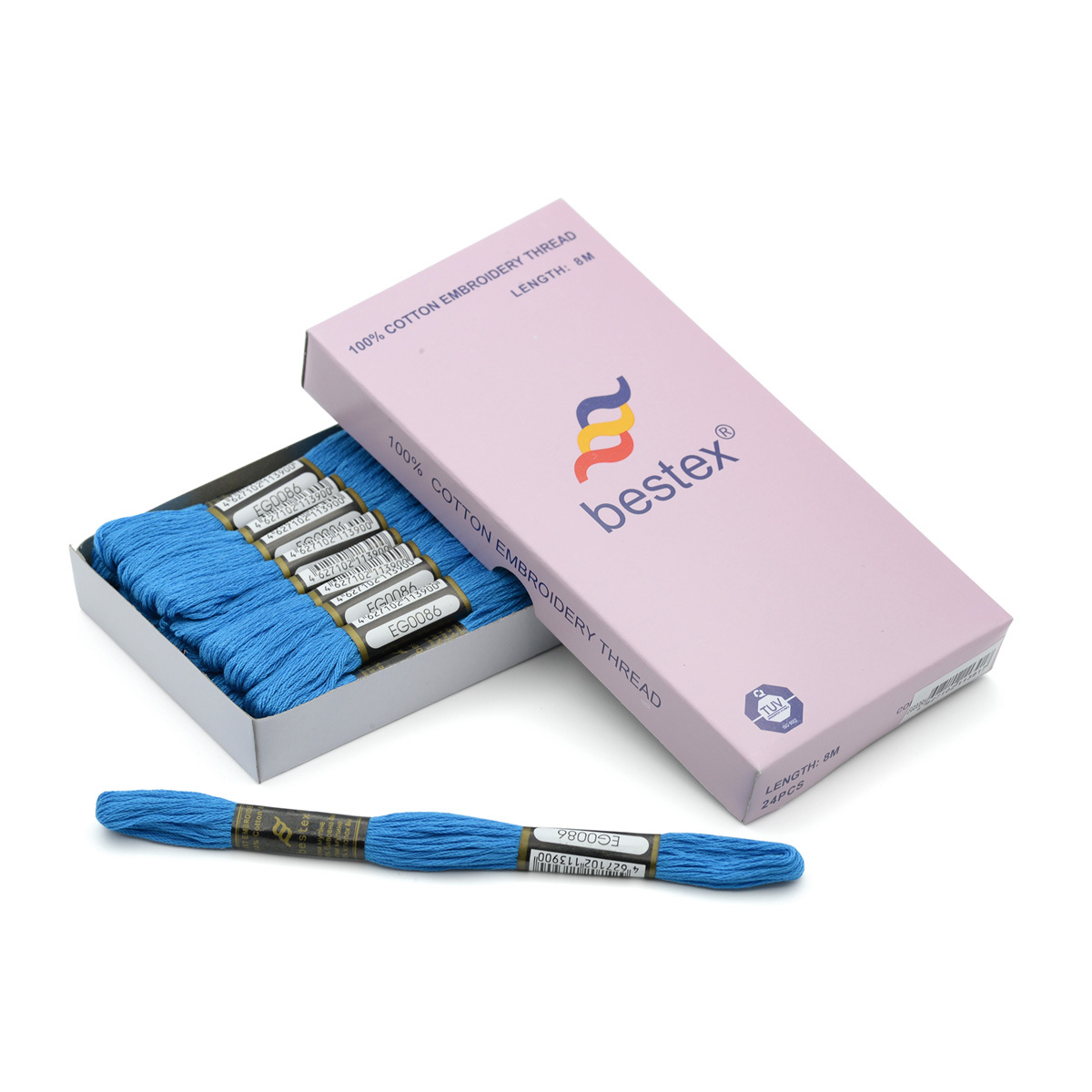 Набор ниток мулине от Bestex подойдет как начинающим, так и опытным мастерицам. Нитки изготовлены из мерсеризованного хлопка, имеют мягкий блеск. Тонкие, износостойкие, равномерные по всей длине. При вышивании образуются аккуратные стежки. Используйте эти мулине, чтобы: – осваивать азы вышивки крестом, гладью и другими техниками; – вышивать буквы, надписи, кайму или орнаменты; – воплощать оригинальные авторские задумки. Каждая пасма состоит из 6 отдельных нитей одинаковой тонины. Благодаря новейшим технологиям нитки яркие, легкие, равномерные по всей длине, без утолщений, разрывов и узелков. Четко выраженная структура нити позволяет использовать мулине для сюжетов со сплошной зашивкой. Вся продукция Bestex имеет экологический сертификат Oeko-Tex. В наборе 24 шт.