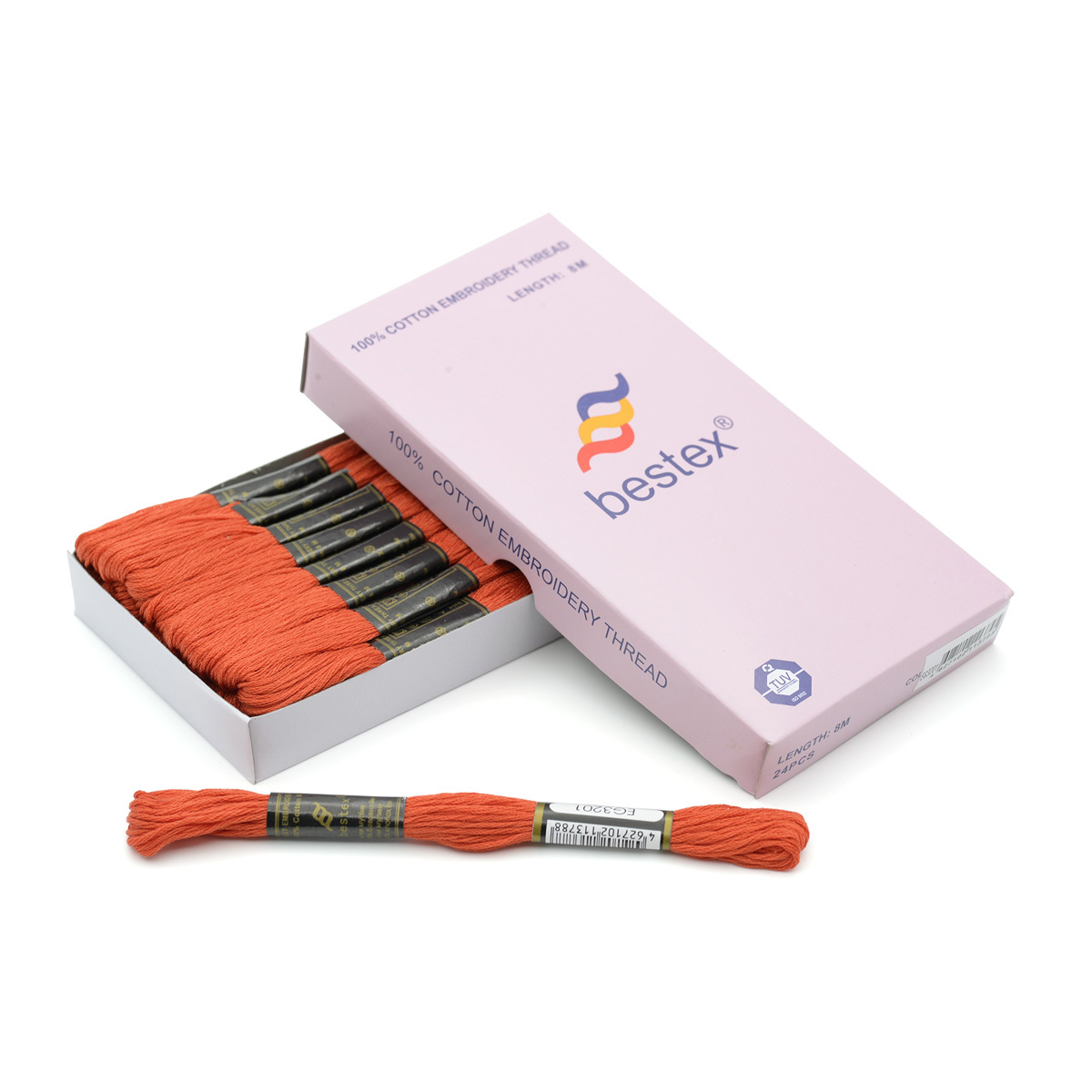 Набор ниток мулине от Bestex подойдет как начинающим, так и опытным мастерицам. Нитки изготовлены из мерсеризованного хлопка, имеют мягкий блеск. Тонкие, износостойкие, равномерные по всей длине. При вышивании образуются аккуратные стежки. Используйте эти мулине, чтобы: – осваивать азы вышивки крестом, гладью и другими техниками; – вышивать буквы, надписи, кайму или орнаменты; – воплощать оригинальные авторские задумки. Каждая пасма состоит из 6 отдельных нитей одинаковой тонины. Благодаря новейшим технологиям нитки яркие, легкие, равномерные по всей длине, без утолщений, разрывов и узелков. Четко выраженная структура нити позволяет использовать мулине для сюжетов со сплошной зашивкой. Вся продукция Bestex имеет экологический сертификат Oeko-Tex. В наборе 24 шт.