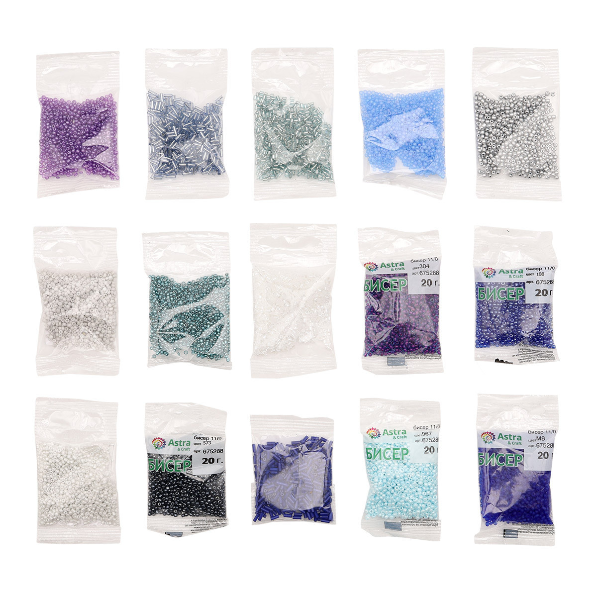 Набор бисера стекляруса, рубки №1, 15 цв., 200 гр (10 цв. по 10 гр + 5 цв. по 20 гр), Astra&Craft