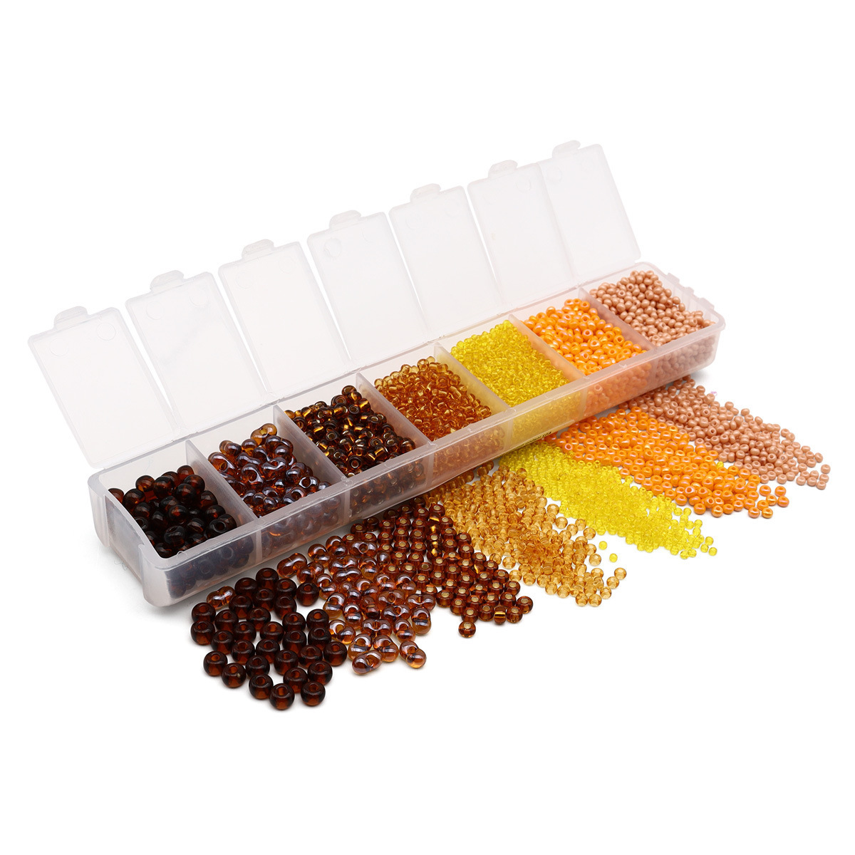 Набор разноцветного бисера из чешского стекла. Бисер аккуратно откалиброванный, однородный по размеру и без бракованных элементов. Бисер круглой формы – универсальный, подходит и для вышивки, и для плетения украшений, фигурок, других поделок. Упакован в пластиковый контейнер с 7 ячейками, каждая ячейка имеет отдельную крышечку и легко открывается. Бисеру из чешского стекла Preciosa доверяют мастера со всего мира. Он длительно сохраняет цвет и яркость, в том числе под воздействием косметики, при контакте с кожей. Вышитые бисером изделия допускается стирать в ручном режиме при температуре до 40 градусов Цельсия. Набор включает 7 цветов бисера по 10-11 г: коралловый 10/0 (возможна замена на желтый 10/0, либо на прозрачный желтый 10/0), прозрачный желтый 12/0, непрозрачный радужный оранжевый 9/0, золотой 9/0 (возможно замена на коричневый 8/0, либо оранжевый 10/0, либо св.коричневый 10/0), коричневый 8/0, прозрачный янтарный 8/0 (возможна замена на светло-янтарный 8/0), коричневый 4/0. Внимание! Оттенки бисера могут незначительно отличаться от представленных на фотографии. Это зависит от партии товара, настроек монитора, освещения, а также светоотражающих свойств материала.