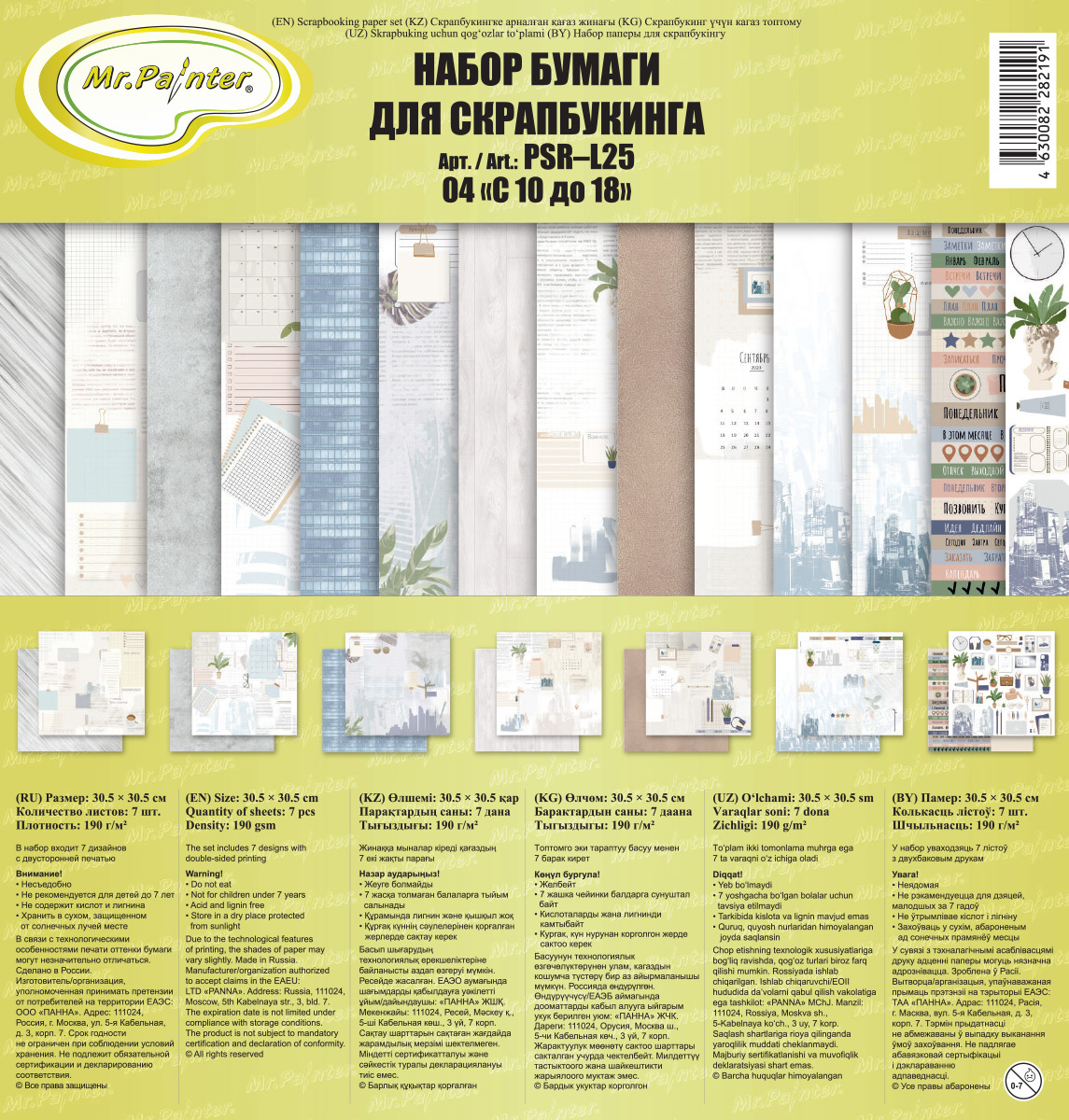 Набор бумаги для скрапбукинга "Mr.Painter" PSR-L25 состоит из 6 двусторонних листов коллекции и 1 лист для вырезания.