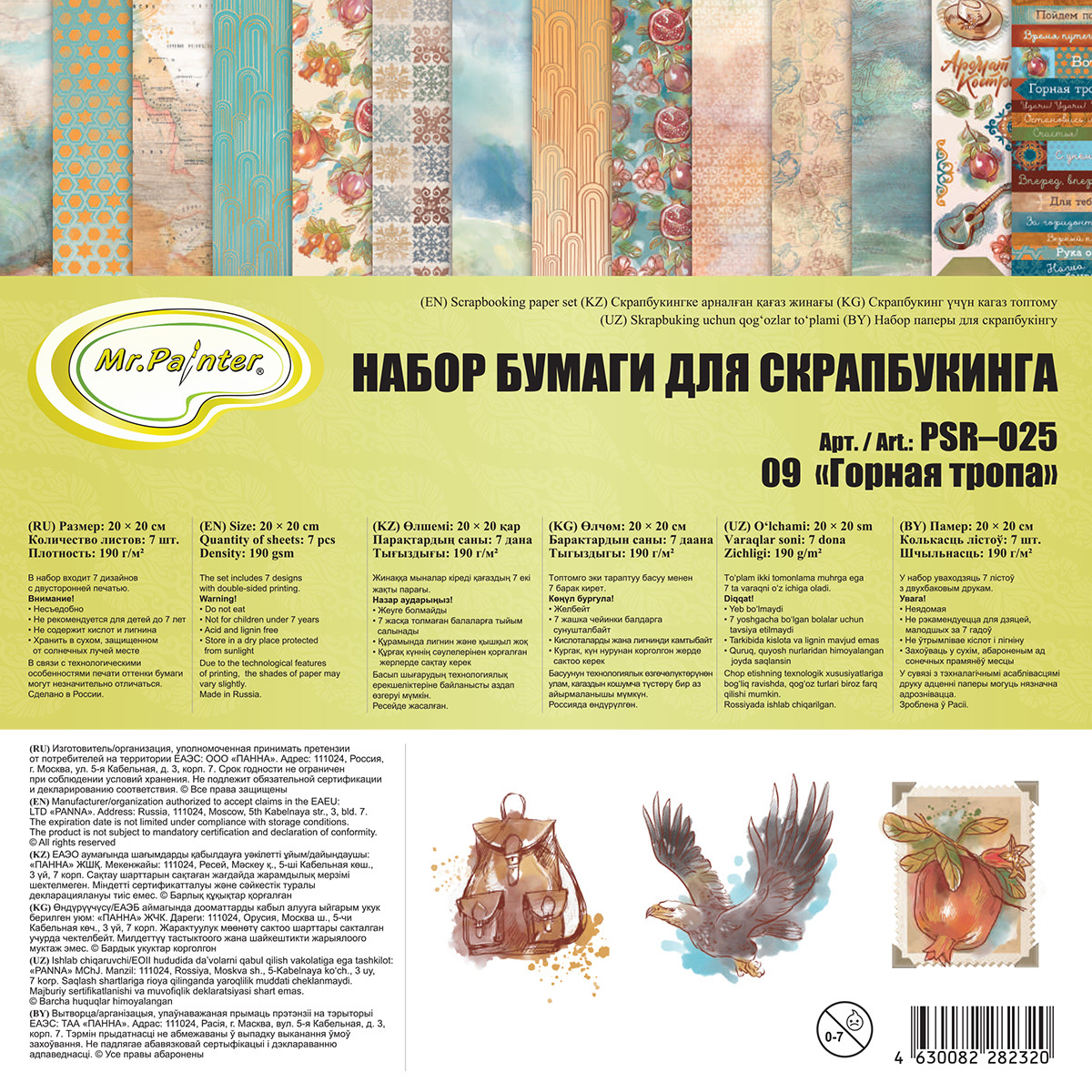 Набор бумаги для скрапбукинга 190 г/м², 20х20 см, 3х7 шт, 09 Горная тропа, Mr.Painter PSR-O25