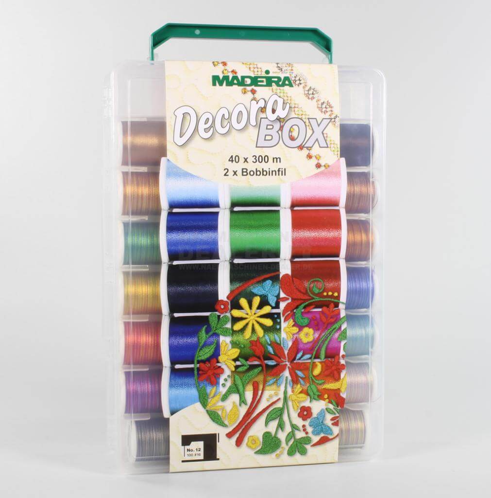 Набор вышивальных ниток Madeira 28*300м Decora №12, 12*300мDecora №12 Multicolor, 2*1000м Bobbinfil №60 28 катушек 300м Decora №12 (полиэстер) 12 катушек 300м Decora №12 Multicolor (полиэстер) 2 катушки нижней нити 1000м Bobbinfil №60 полиамид набор игл вышивальных Рекомендуются для машинного вышивания на бытовых и промышленных вышивальных и швейно-вышивальных машинах любых марок.