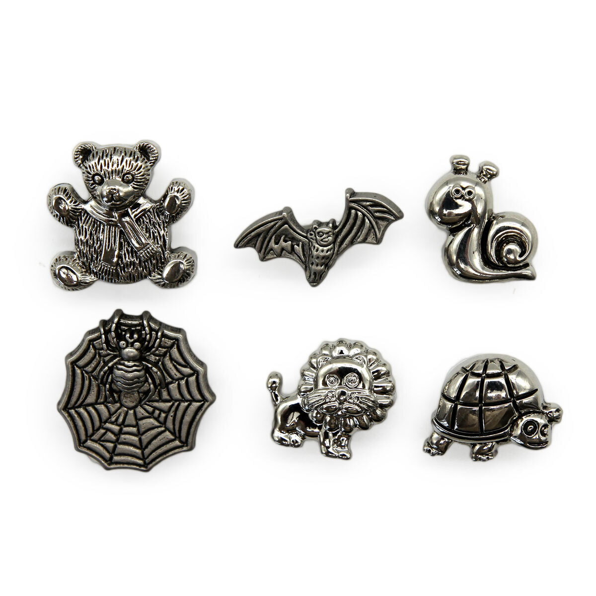 Набор пуговиц 'Зверята' создан для любителей мастерить оригинальные поделки из подручных материалов. Россыпь пуговиц разных дизайнов и форм – основа для ваших творческих проектов. Несколько идей: – оформите пуговицами застежку на детской одежде; – украсьте детские вещи и аксессуары (сумки, головные уборы); – декорируйте авторскую открытку, обложку, блокнот в технике скрапбукинга; – используйте пуговицы с рисунком как часть композиции для декоративного панно; – расшейте пуговицами прихватку или рукавицу. В наборе: пуговицы 'Мишка' (21 мм), 'Черепашка' (18 мм), 'Летучая мышь' (21 мм), 'Паук' (21 мм), 'Лев' (18 мм), 'Улиточка' (18 мм), всего 24 шт, по 4 шт. каждого вида. Цвет: серебро.