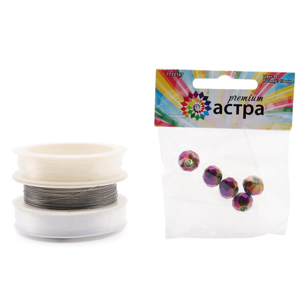 Этот набор подходит тем, кто хочет научиться плетению из бисера или планирует небольшой проект. Комплектующие в наборе позволяют использовать разные техники и решить разные задачи. Проволока подходит для фигурок из бисера или деталей, которые должны сохранять форму. Леску используют для плетения классических узоров. Силиконовая нить подойдет для эластичных браслетов, которые легко надеть на руку. Прилагаются стеклянные бусины: можете добавить их к своему проекту, чтобы дополнить орнамент из бисера более крупными деталями. В наборе: нить силиконовая для бисера 0,3 мм, длина 25 м; проволока с нейлоновым покрытием, толщина 0,3 мм, длина 10 м, леска толщиной 0,3 мм, длиной 100 м. Бонус: бусины стеклянные фиолетовые (5 шт.), диаметр 12 мм.