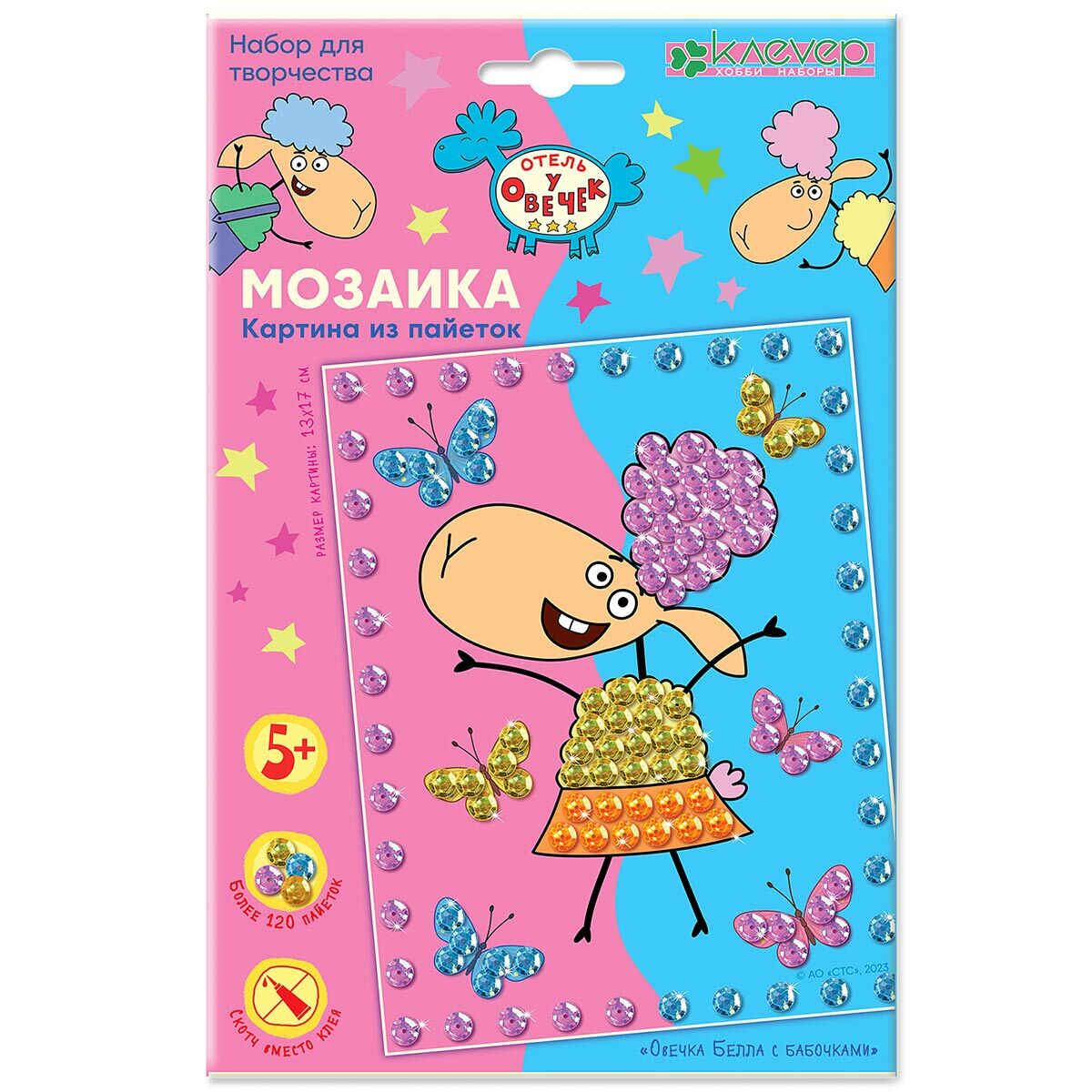 Сделать своими руками мозаику из пайеток 'Отель у овечек. Овечка Белла с бабочками' от бренда 'Клевер' – это быстро и просто, в комплекте уже прилагаются все элементы и материалы, а также инструкция. Набор подходит для детского творчества (от 5 лет), помогает развивать усидчивость, внимательность, художественный вкус, мелкую моторику рук. Чтобы выложить мозаику, не понадобится клей, поэтому рабочее место не испачкается. В наборе: цветные пайетки, полоски двустороннего скотча, картонный фон-картина, инструкция на упаковке. Размер картонной основы: 13х17 см. Разработано и произведено в России компанией 'Клевер'. Компания выпускает наборы для творчества в опоре на современные методики развития ребенка.