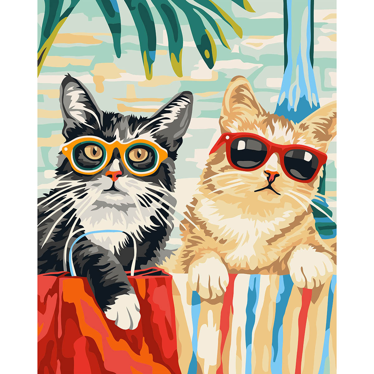 Картина по номерам - это набор для создания готового произведения искусства. Картина c модными котами на отдыхе вызывает улыбку и напоминает о важности легкости и юмора в жизни. На холст нанесён контур будущего шедевра. Все области пронумерованы и соответствуют номерам на баночках с красками. Все, что нужно сделать - раскрасить каждый сектор тем номером краски, который в нем проставлен. Краски не нужно смешивать или разбавлять. Все оттенки заранее подобраны, а контуры специально проработаны художниками и дизайнерами. Набор для создания картины подходит для любого возраста и не требует художественных навыков. А готовая работа отлично подойдёт в качестве подарка или украшения к интерьеру. В набор входят акриловые краски – они яркие, стойкие и быстро высыхают. Краски из акрила плотные, отличаются хорошей кроющей способностью, не содержат токсичных веществ и безопасны даже для детей. Эффект настоящей живописи завершает холст с галерейной натяжкой. Финишный лак защитит готовую картину от пыли и других внешних воздействий. В наборе: грунтованный холст с контурным рисунком на деревянном подрамнике; краски акриловые в баночках - 23 цв.; кисти из эластичного нейлонового волокна (3 шт.); финишный лак; крепления на стену; QR-код контрольного листа. Количество цветов: 23. Размер: 40х50 см.