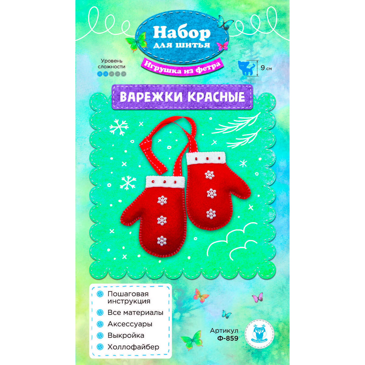 Любите мастерить игрушки своими руками? Набор для шитья игрушки из фетра 'Варежки красные' создан для вас. Добавьте готовую игрушку в свою коллекцию сувениров или подарите ее близкому человеку. Фетр – прекрасный материал для творчества, он окрашен в яркие цвета, не осыпается и хорошо держит форму. Мягкая фактура фетра с небольшим ворсом создает впечатление уюта и удачно вписывается в домашнюю атмосферу. Рекомендации: нитки и игла не входят в комплект – подберите их самостоятельно. Чтобы аккуратно вырезать детали выкройки, выберите ножницы небольшого размера с остро заточенными концами. В наборе: фетр необходимых цветов, аксессуары, наполнитель (холлофайбер), инструкция. Размер готовой игрушки: 9 см.