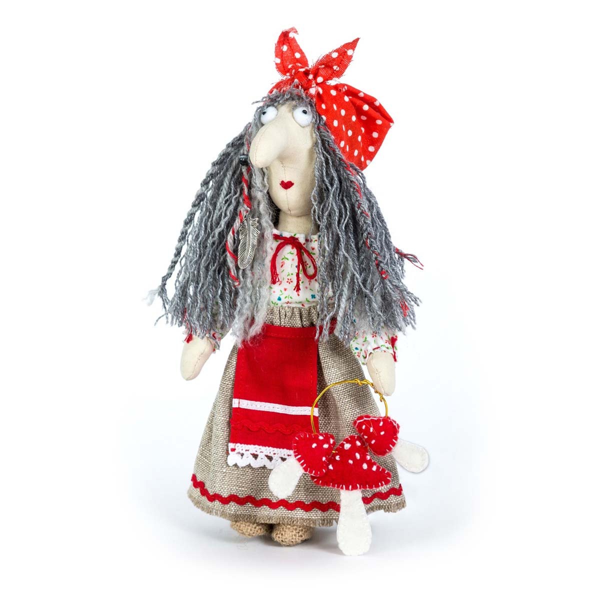 У каждой интерьерной игрушки от дизайн-студии Кукла Перловка – свой характер и своя история. Куклы серии Домовенок и компания созданы по мотивам древних сказок и напоминают персонажей мультфильмов. Украсьте такой игрушкой интерьер, и она поможет вам создать веселую, беззаботную атмосферу, будет напоминать о счастливом детстве. Готовая игрушка – прекрасный подарок. В наборе: ткань для игрушки и одежды (хлопок, лен), волнистая тесьма, пряжа для волос, нитки мулине, декор, выкройки и подробная инструкция. Дополнительно понадобятся: наполнитель синтепон или синтепух. Размер: высота игрушки примерно 21 см.