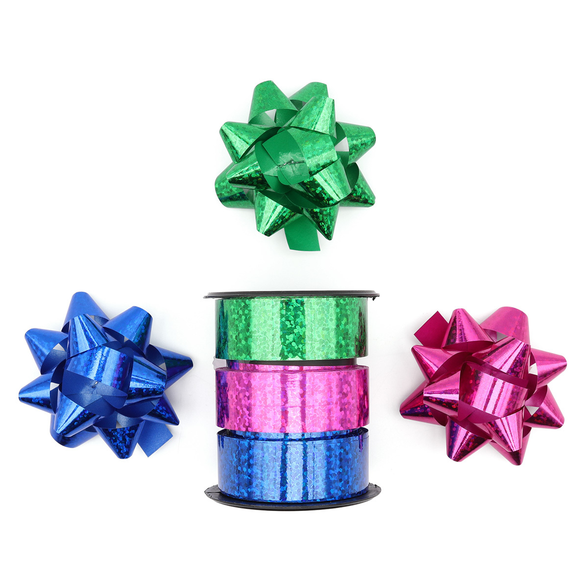 Набор для упаковки подарков включает 3 пластиковые ленты и 3 пышных банта. Такой декор удачно впишется в праздничную обстановку. Украсьте ими подарочную коробку или пакет, букет живых или искусственных цветов, используйте его для оформления праздничного интерьера, для создания поделок. Для фиксации подойдет клей, двусторонняя клейкая лента или степлер. Выгодно сочетается с однотонными материалами нежных приглушенных или 'природных' расцветок. Банты прочные, хорошо держат форму и поэтому не будут опадать. Цвет: ассорти.