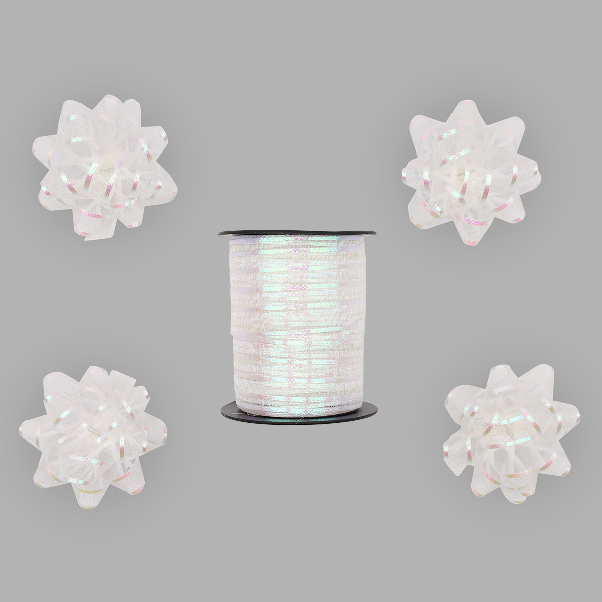 Набор для упаковки подарков включает пластиковую ленту и 4 пышных банта. Такой декор удачно впишется в праздничную обстановку. Украсьте ими подарочную коробку или пакет, букет живых или искусственных цветов, используйте его для оформления праздничного интерьера, для создания поделок. Для фиксации подойдет клей, двусторонняя клейкая лента или степлер. Выгодно сочетается с однотонными материалами нежных приглушенных или 'природных' расцветок. Банты прочные, хорошо держат форму и поэтому не будут опадать. Размер ленты: 1 см в ширине и 10 м в длине.
