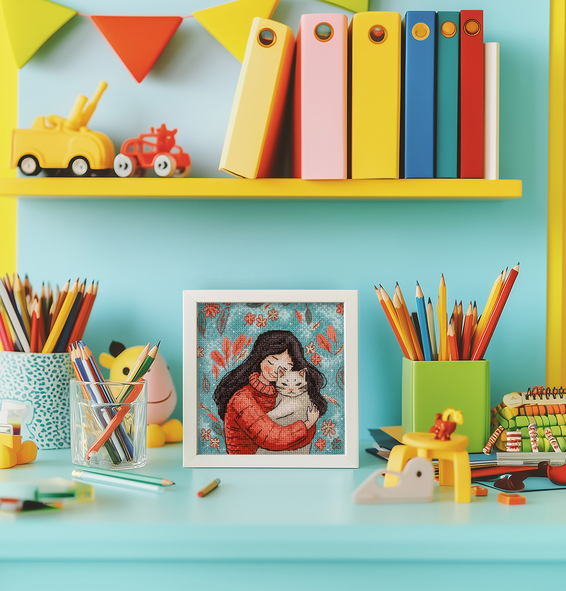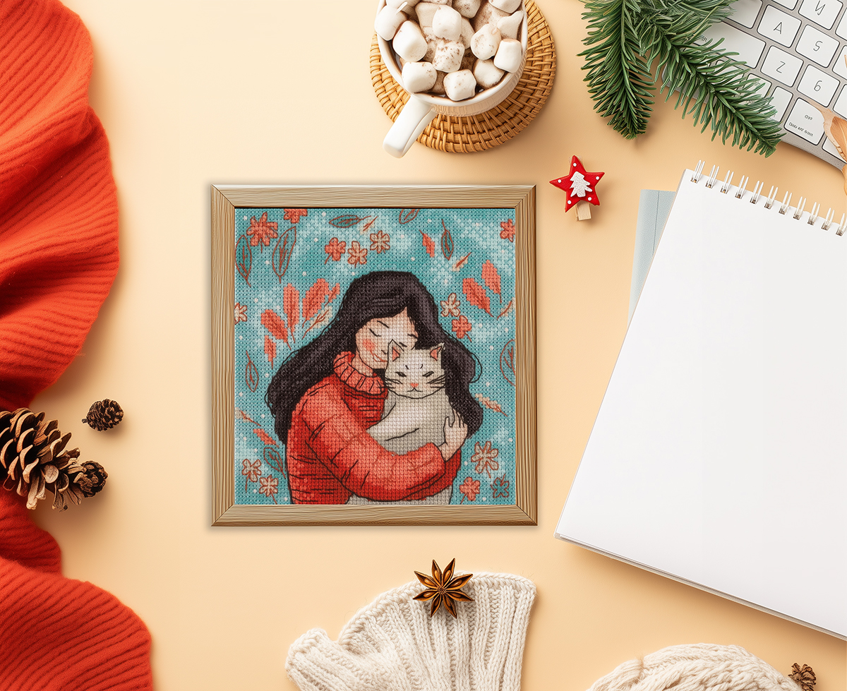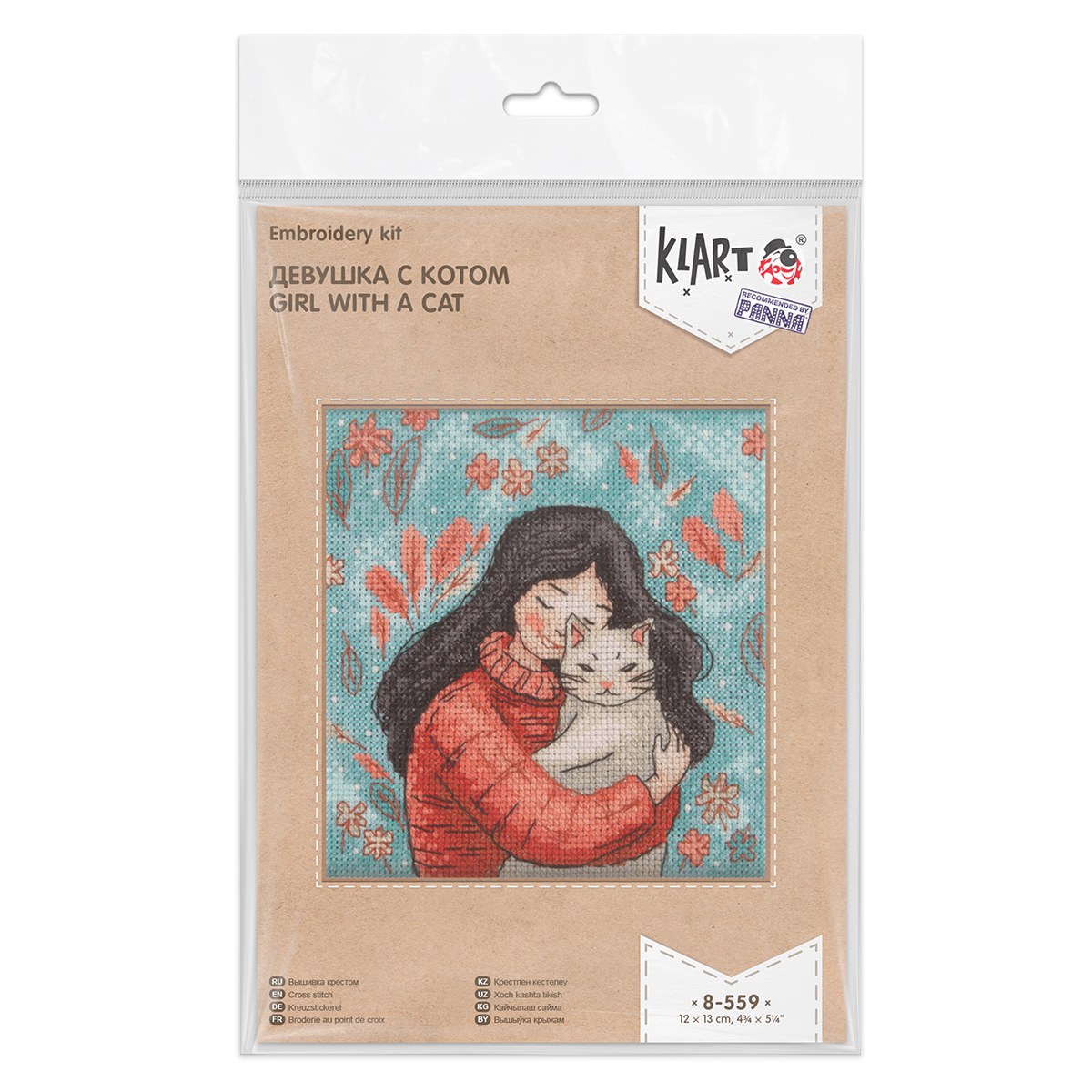 Набор для вышивания нитками Klart 8-559, Девушка с котом, 12х13 см