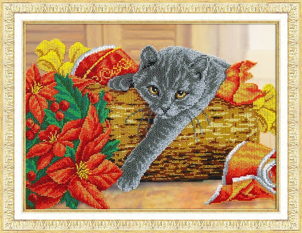 Набор для вышивания бисером Паутинка, Рождественский котик 38х28 см, Б-1503