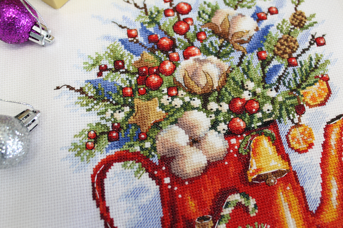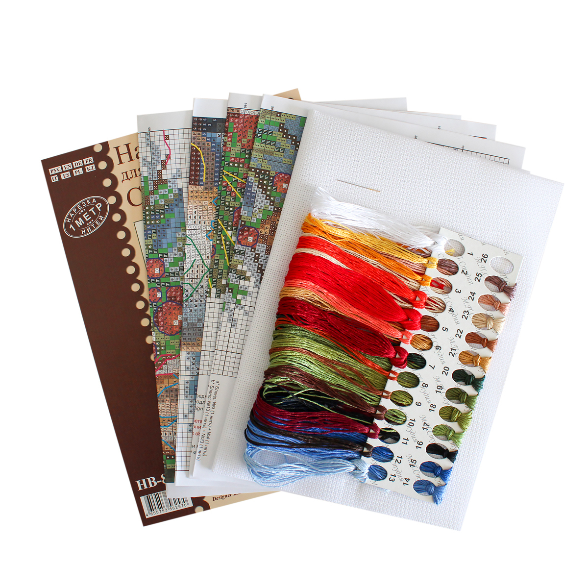 Состав: хлопчатобумажная канва 16 каунта, нитки мулине Гамма 25 цветов, разобранные на органайзере, игла, цвето-символьная схема и руководство по вышиванию.