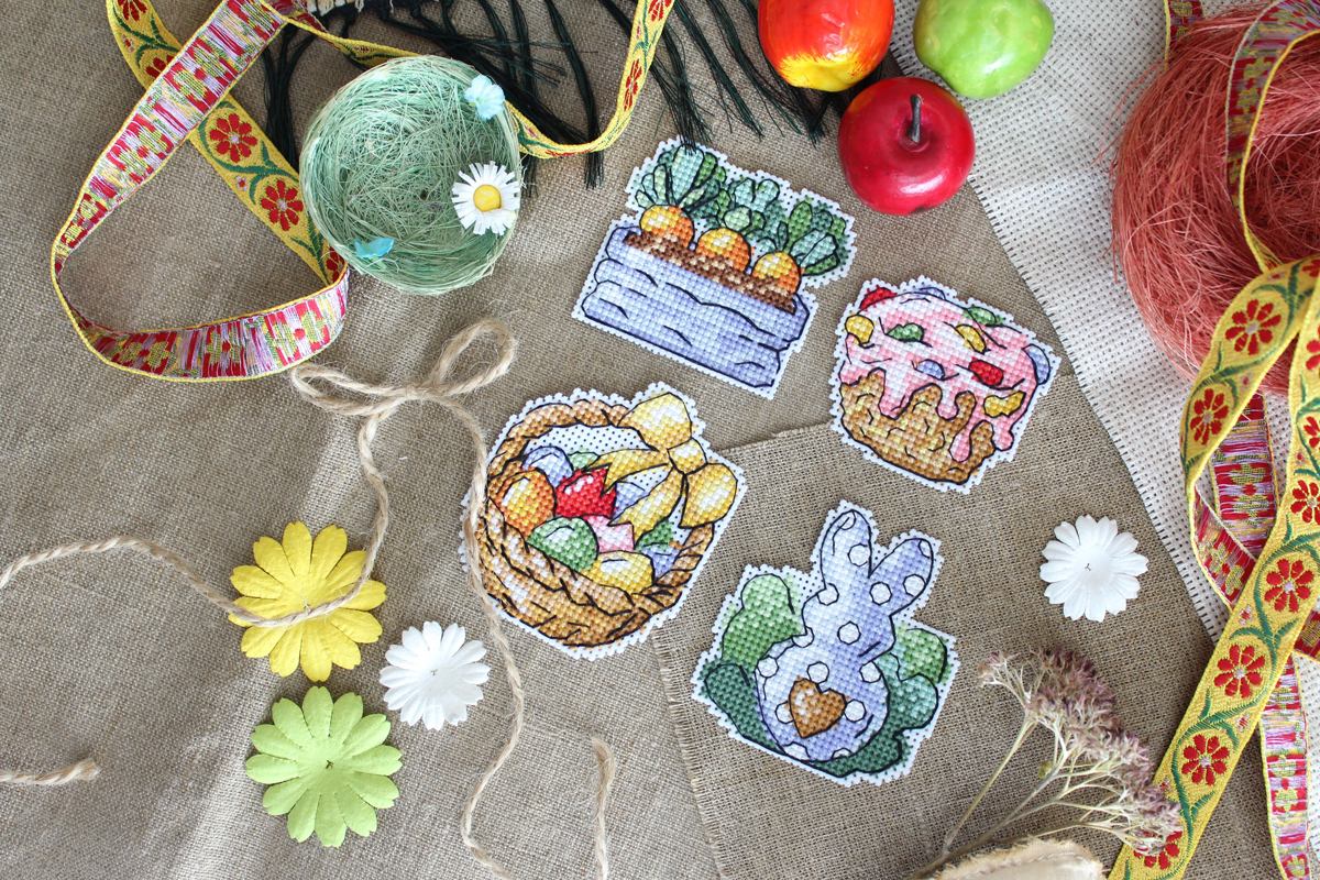 Состав: канва пластиковая 14 каунта, нитки мулине 19 цветов, разобранные на органайзере, магнитное полотно, игла, схема и руководство по вышиванию.