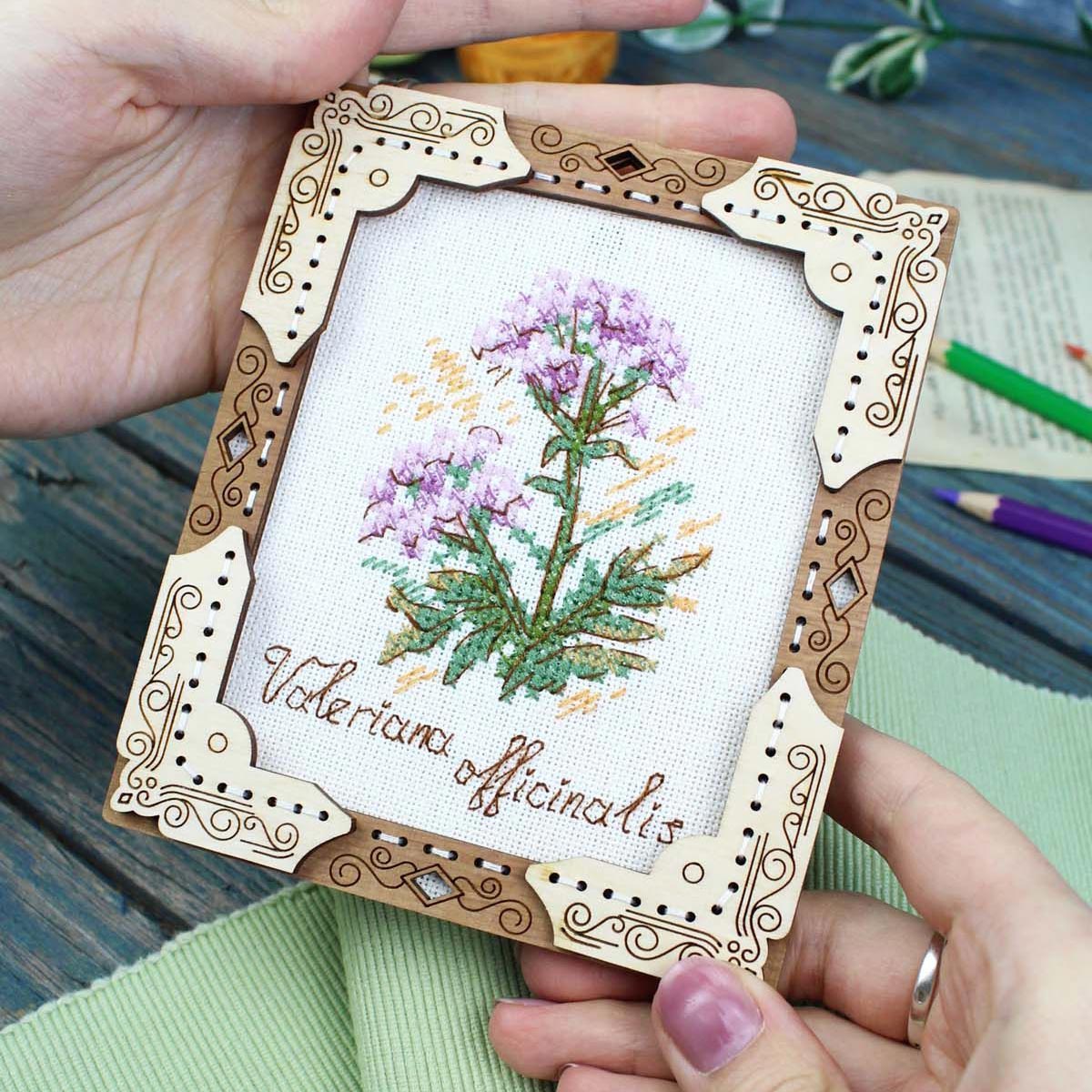 Вышивка крестиком набор Миниатюра. Валериана 13х11 представляет собой уникальную возможность создать красивый и оригинальный сувенир на деревянной основе с минимальными усилиями. Деревянная рамка не только обеспечивает прочность и долговечность работы, но и создает особый эстетический эффект, подчеркивая натуральность и теплоту материала. Полученная вышивка крестом представляет собой готовое произведение и не требует дополнительного оформления в виде багета. Основа из дерева не нуждается в специальной обработке, но при желании вы можете предварительно покрыть края лаком, морилкой или даже расписать акриловыми красками. Важно помнить: дайте покрытию полностью высохнуть перед продолжением работы, чтобы избежать повреждений вышивки и сохранить целостность ниток. Процесс вышивания на деревянной основе не требует особых навыков и подойдет как для опытных рукодельниц, так и для новичков. Вышивка позволяет тщательно проработать все детали изображения, делая его реалистичным и выразительным. Вышивка крестиком украсит ваш дом или станет отличным подарком близким людям. Набор для вышивания крестиком включает в себя все необходимые материалы для создания неповторимого полотна, подробная инструкция позволит легко разобраться с тонкостями вышивки даже начинающим. В наборе: ткань равномерного переплетения Гамма (Линда k27), мулине ПНК им. Кирова, деревянная рама, игла, лента, бумажная схема и электронная схема Makosh, руководство по вышиванию.
