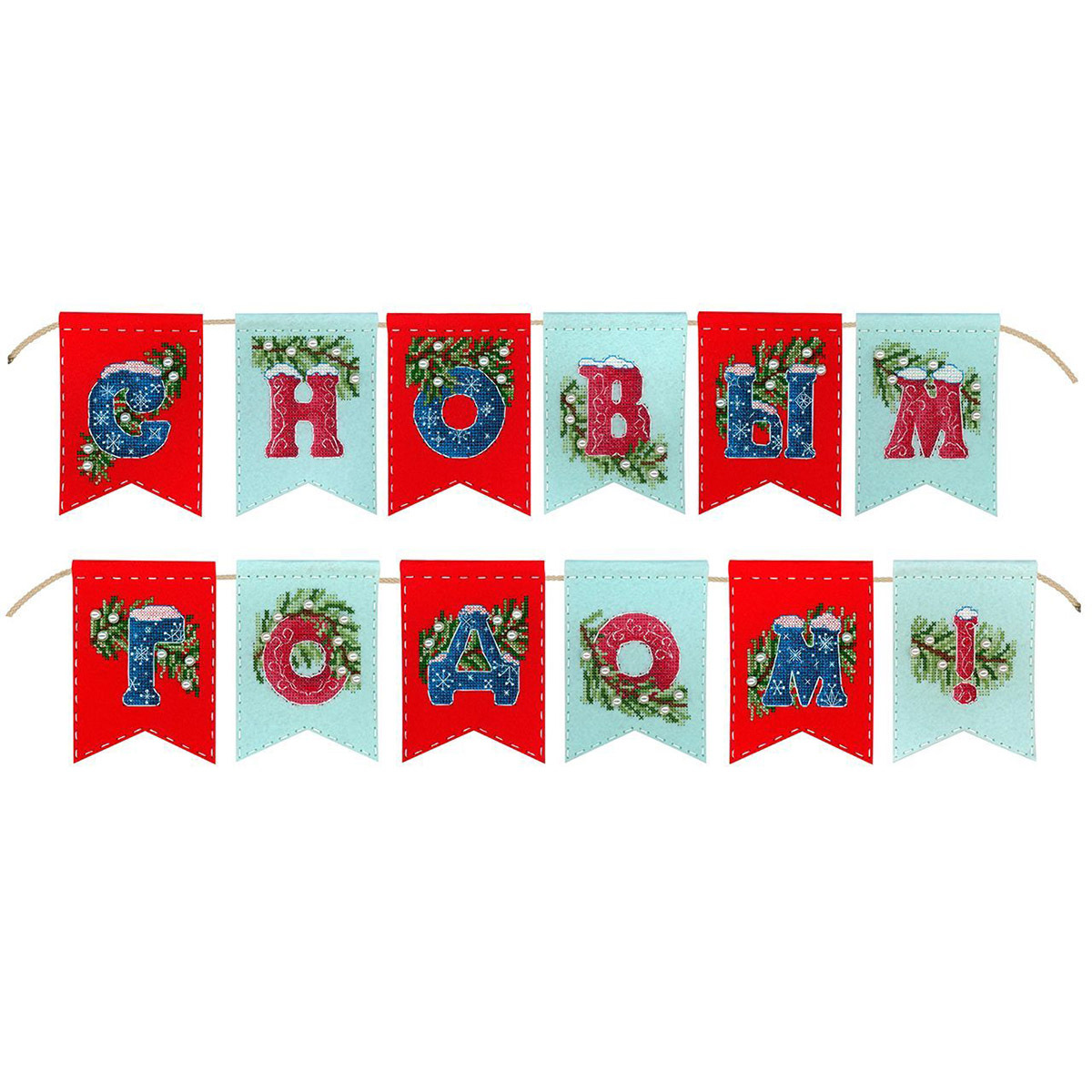 Набор для вышивания нитками МП Студия Т-1009, на фетре Гирлянда С новым годом! 12 флажков по 12х8 см