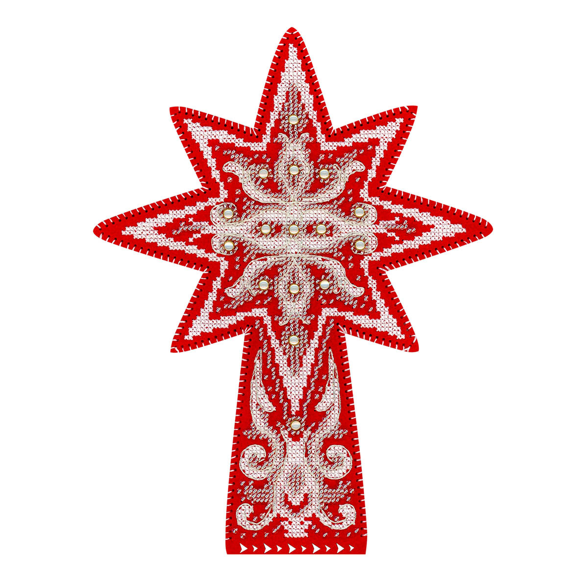Набор для вышивания оригинального сувенира 'Морозные узоры. Звезда на вершину' на перфорированном фетре представляет собой уникальную возможность создать красивую вышивку с минимальными усилиями. Готовый сувенир станет ярким и оригинальным аксессуаром, который поднимет настроение и украсит любое пространство. Кроме того, данная игрушка отлично украсит макушку вашей новогодней елочки. Благодаря перфорации, нанесённой на плотный фетр, стежки получаются ровными и одинаковыми по наклону. Этот готовый сувенир украсит ваш дом и станет уютным элементом интерьера. Процесс вышивания на фетре не требует особых навыков и подойдет как для опытных рукодельниц, так и для новичков. Вышивка выполняется в технике счетный крест, бисер что позволяет тщательно проработать все детали изображения, делая его реалистичным и выразительным. В наборе: перфорированная основа из красного фетра, хлопковое мулине 'ПНК им.Кирова' - 1 цв., нитки металлик - 1 цв., бисер Preciosa - 1 цв., пуговицы - 19 шт., черно-белая символьная схема, инструкция. Количество цветов: 1. Частичная зашивка. Техника: счетный крест, бисер. Размер: 23x18 см.