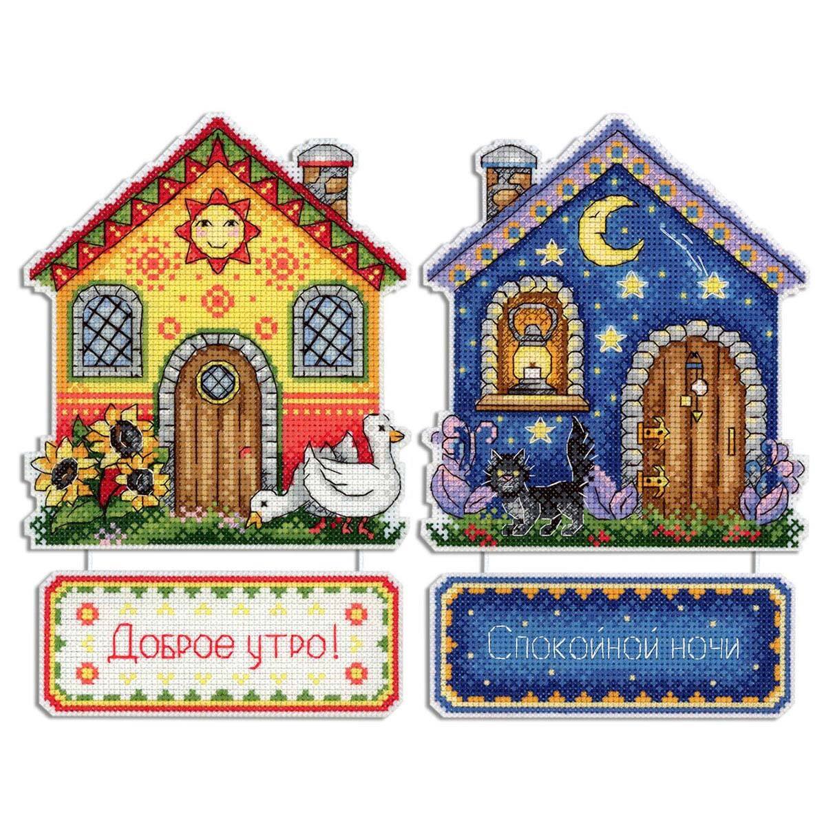 Создайте яркий вышитый сувенир Дом луны и солнца – это увлекательно и просто, достаточно владеть техникой крест и точно следовать инструкции. Пяльцы или рамки не понадобятся – пластиковая канва отлично держит форму. Готовые элементы надо вырезать по контуру и соединить между собой аккуратными стежками. При желании между деталями игрушки можно вклеить или вшить ленту-подвес. В наборе: канва пластиковая 14 каунта, нитки мулине ПНК им.Кирова, разобранные на органайзере, игла, схема и инструкция. Количество цветов: 25. Размер готового сувенира: 13х19 см.