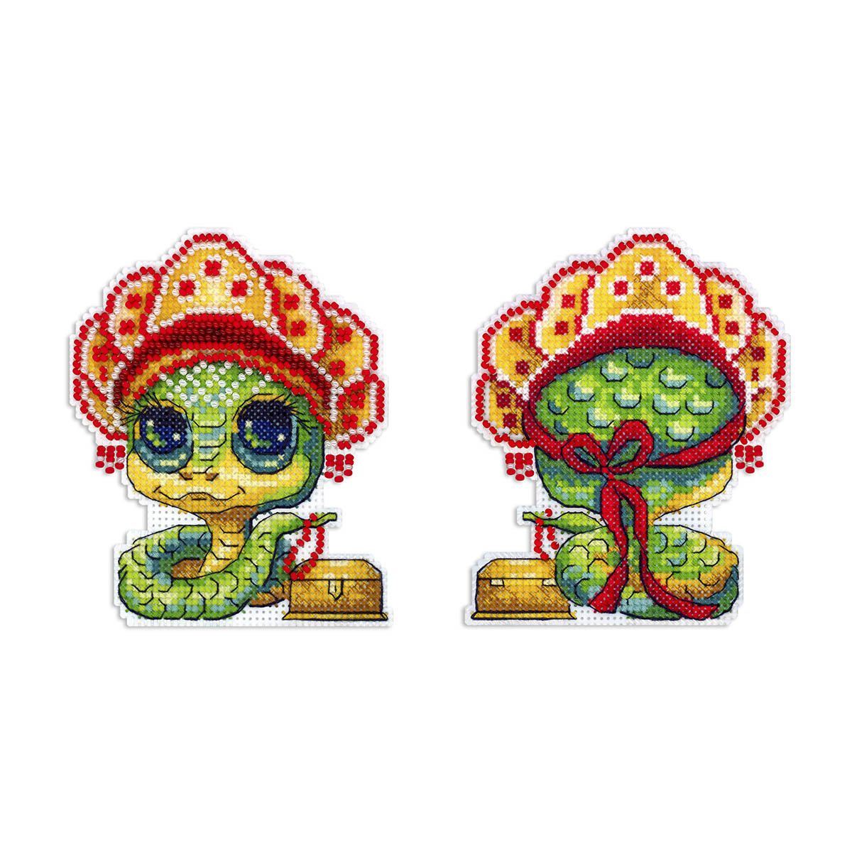 Набор для вышивания на пластиковой канве 'Змейка в кокошнике' представляет собой уникальную возможность создать красивую и оригинальную вышивку с минимальными усилиями. Пластиковая канва прекрасно держит форму, поэтому пяльцы и рамки не нужны. Нужно вырезать детали по контуру и сшить их аккуратными стежками. При желании можно добавить между элементами ленту для подвешивания. Полученная вышивка представляет собой готовое произведение и не требует дополнительного оформления в виде багета или рамки. Основа из пластика не нуждается в специальной обработке. Этот сувенир украсит ваш дом к новогодним праздникам или станет отличным подарком близким людям. Процесс вышивания на пластиковой канве не требует особых навыков и подойдет как для опытных рукодельниц, так и для новичков. Вышивка выполняется в технике счетный крест, назад иголку (бэкстич), бисер, что позволяет тщательно проработать все детали изображения, делая его реалистичным и выразительным. В наборе: канва пластиковая 14 ct белая, хлопковое мулине 'ПНК им.Кирова 16 цв., бисер Preciosa- 4 цв., игла, черно-белая символьная схема, инструкция. Количество цветов: 16. Частичная зашивка. Размер: 11х9 см.