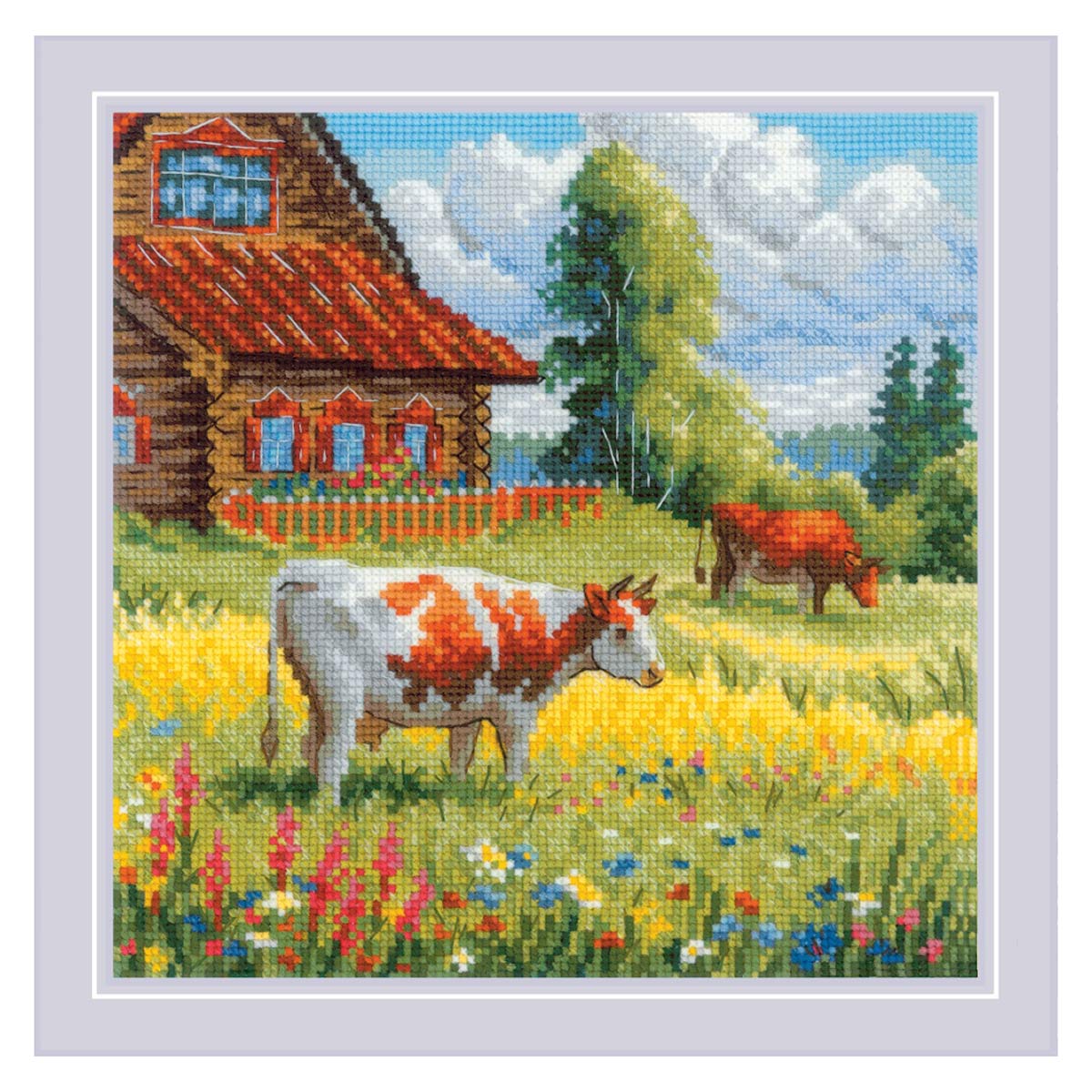 Вышивка крестиком набор от Риолис Золотое лето. Околица 20х20 см - это превосходный выбор для тех, кто ценит творчество, рукоделие и хобби. Набор для вышивания отлично подходит как для начинающих, так и для опытных вышивальщиц. Вышивка крестом своими руками - увлекательное занятие и прекрасный способ расслабиться и отдохнуть. Вы сможете создать уникальное и неповторимое украшение комнаты, которое будет напоминать о ваших талантах и ручной работе. Вышивка крестиком - прекрасный подарок маме, бабушке, сестре, подруге на Новый Год, день рождения, новоселье и 8 марта. Этот набор для вышивания - часть триптиха Золотое лето. Вы можете оформить каждый сюжет отдельно или вышить все сюжеты в виде панорамной композиции на отрезе канвы подходящего размера. Ее нужно будет приобрести самостоятельно. В центре композиции домик в деревне, возле которого пасутся коровы. Каждая деталь проработана с невероятной точностью, передавая атмосферу уютного летнего дня. Готовая работа станет идеальным украшением интерьера, напоминая о хрупкой красоте природы. Вышивка крестиком в наборе включает в себя все необходимое для создания красивой картины: канву Aida 14 ct белую, нитки шерсть\акрил, иглу, бумажную цвето-символьную схему и QR-код электронной схемы. Этот набор для вышивки крестом станет прекрасным подарком для ваших близких и друзей, особенно для женщин, которые ценят мир рукоделия и творчества.