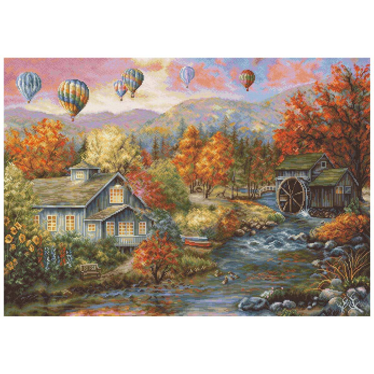 Набор для вышивания крестом Осень. Мельница на ручье - это магическое произведение, которое погружает вас в волшебный мир фантазии и красоты. Готовое изделие станет милым подарком для всех, кто увлекается вышиванием. Образ разноцветных воздушных шаров, парящих над мирным осенним пейзажем, привлекает внимание своими красками и деталями, создавая атмосферу загадочности и волшебства. В каждом стежке скрыта забота и внимание к деталям, что делает вышивку не просто украшением, а источником положительных эмоций и приятных воспоминаний. Такой образ станет прекрасным дополнением к интерьеру и может служить замечательным подарком для любителей рукоделия и тонкой эстетики. Создатели наборов Luca-S позаботились о том, чтобы вы могли сосредоточиться на вышивке и не отвлекаться на посторонние детали: – Картонный органайзер с нитками снабжён обозначениями, соответствующими цветам ниток. Теперь сверяться со схемой стало гораздо удобнее. – Для вышивания применяются высококачественные материалы от известных европейских производителей: канва Zweigart и нитки Anchor. В упаковке: канва Aida 18 ct (Zweigart), мулине Anchor (100% мерсеризованный хлопок), игла №26 (2 шт.), черно-белая символьная схема. Прилагается инструкция на русском языке. Количество цветов: 66. Нитки мулине разобраны на бумажном органайзере. Размер готовой вышивки: 48*34см.