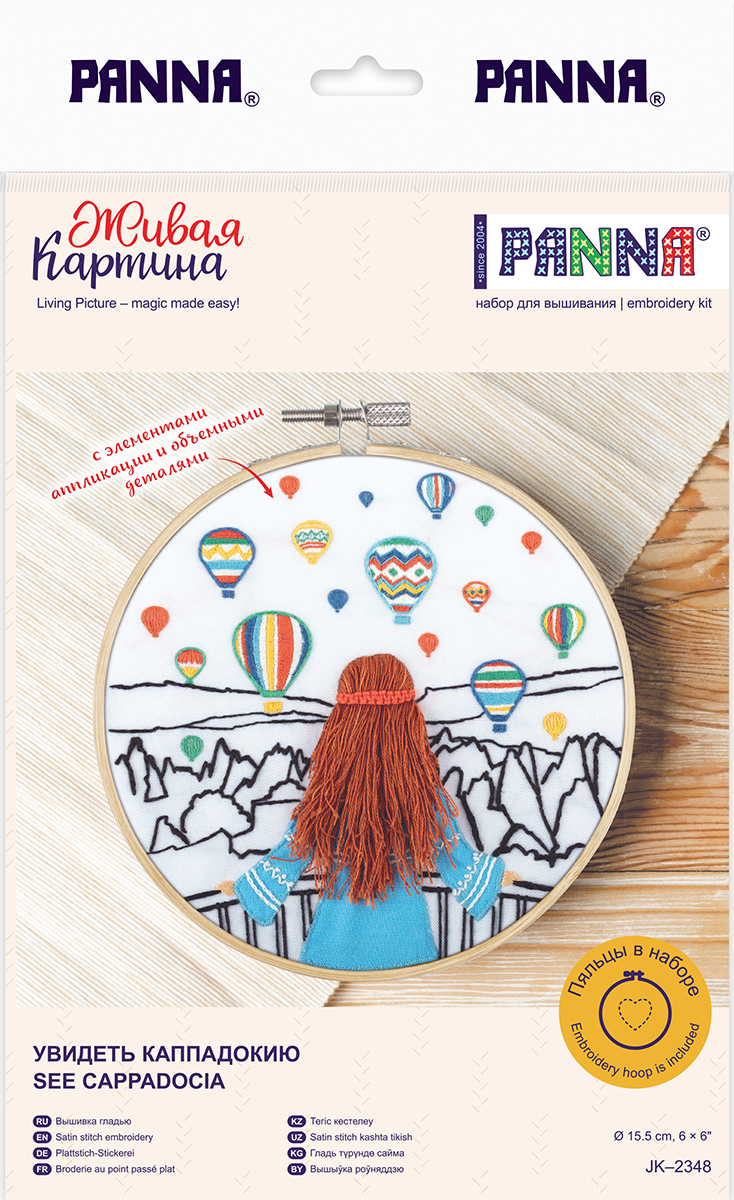 В набор для вышивания в технике гладь PANNA входит: ткань с напечатанным рисунком, хлопчатобумажные нитки мулине Gamma, деревянные пяльцы, хлопковая ткань, игла для вышивания Gamma, подробная инструкция по вышиванию. Вышивка комбинируется с элементами аппликации. Особая деталь - объемные волосы у героини.