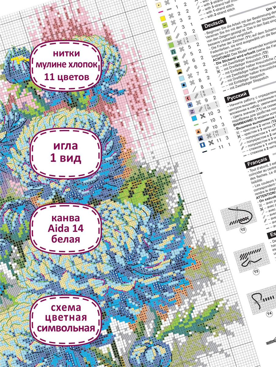 Используются техники: крест, полукрест, стежок, смешанные цвета.
